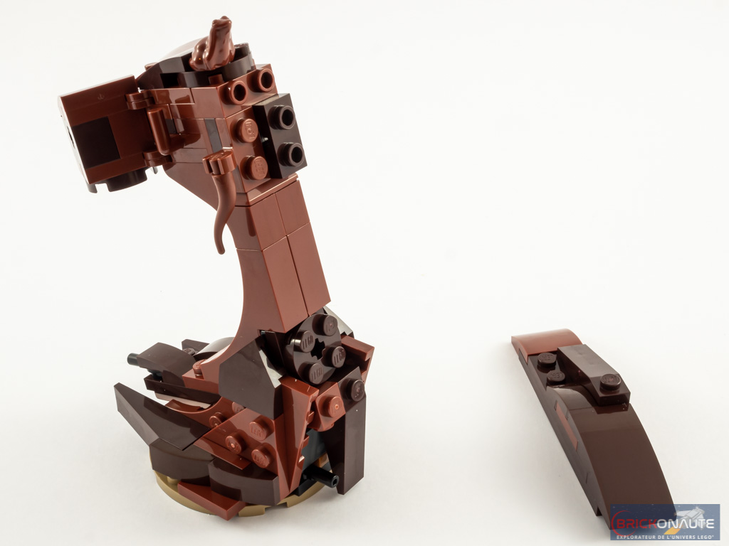 On passe alors à la partie supérieure du tronc. Les slopes sont ici inversées, et un ensemble de 3 charnières permet de créer les amorces des branches. On construit un sous-assemblage pour masquer la partie arrière du tronc, puis nous ajoutons les branches à proprement parler. Il s’agit de jolies pièces cylindriques légèrement courbées, disposant d’une réservation pour un axe Technic. Deux grandes lianes souples courent le long du tronc, et des trompes d’éléphant en dark brown font office de racines.