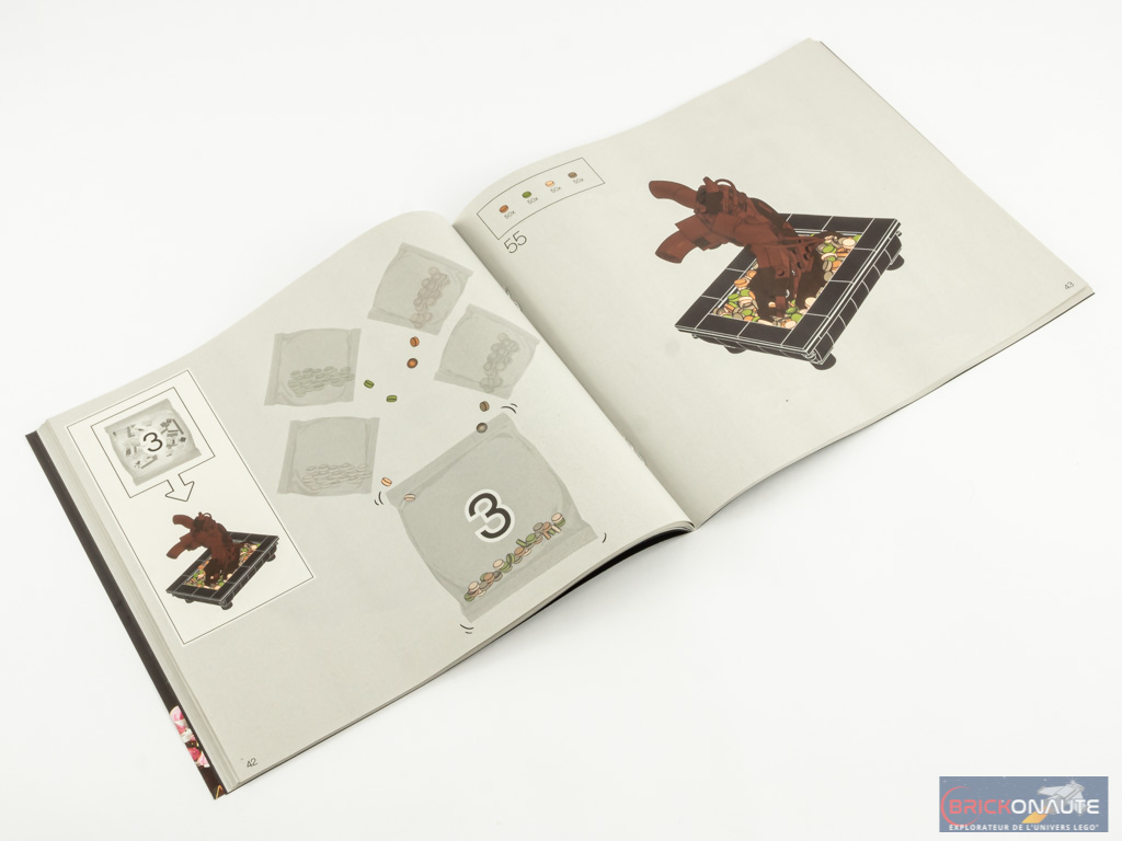 A l’intérieur, nous trouvons 6 sachets de pièces numérotés, deux tiges souples marrons et une notice d’instructions (84 pages pour 103 étapes de construction). Cette notice démarre par une petite présentation du designer et de la genèse du set. Nous retrouvons également une page nous précisant les éléments fabriqués à base de bioplastique, 3 références de pièces dans cette boîte).