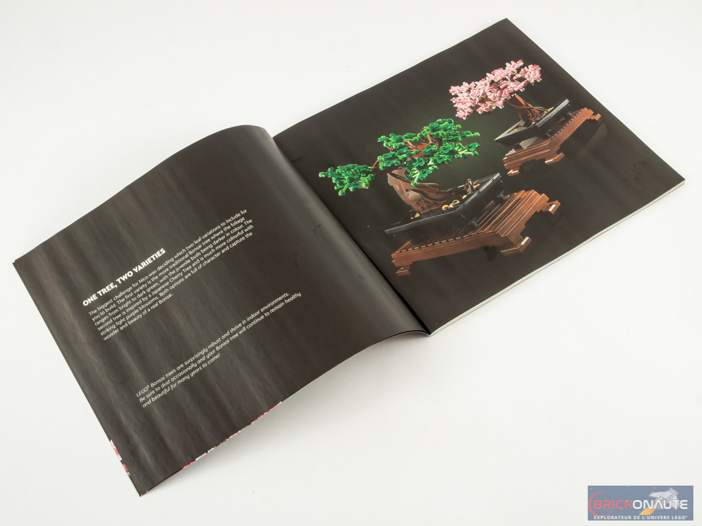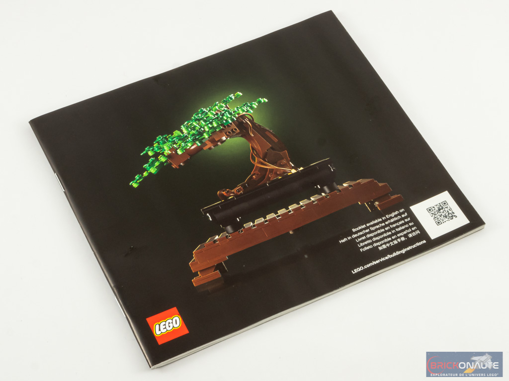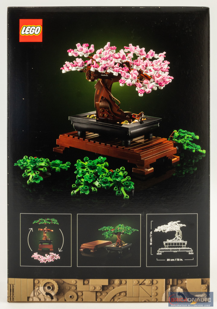 La boîte adopte le même format rectangulaire que le set 10280 Flower Bouquet, et la même livrée noire caractéristique des sets destinés à un public adulte. Sous la photo du set, on en retrouve les informations principales dans un liseré ocre. Au dos, le bonsaï nous est présenté dans sa seconde configuration, avec des feuilles blanches, des bourgeons et des fleurs roses. Une vignette nous précise les dimensions du modèle fini : 20cm de long par 18cm de haut, socle inclus.