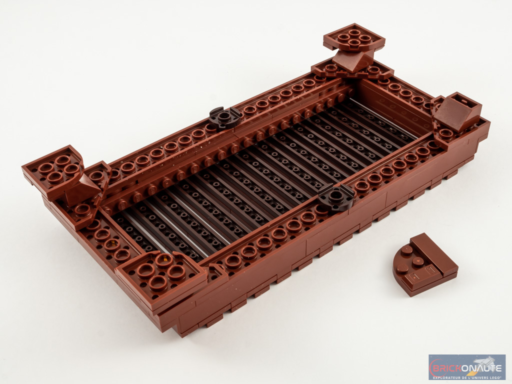 Le tronc est basé sur une plate ronde de 6 tenons de diamètre. On commence par disposer des clips sur celle-ci, avant de s’attaquer au tronc à proprement parler. Deux grandes slopes constituent la base de celui-ci, et on dispose des barres en dessous qui viennent se clipser sur la base : on obtient ainsi un très bel angle. On cache cette fixation de part et d’autre avec deux sous-ensembles.