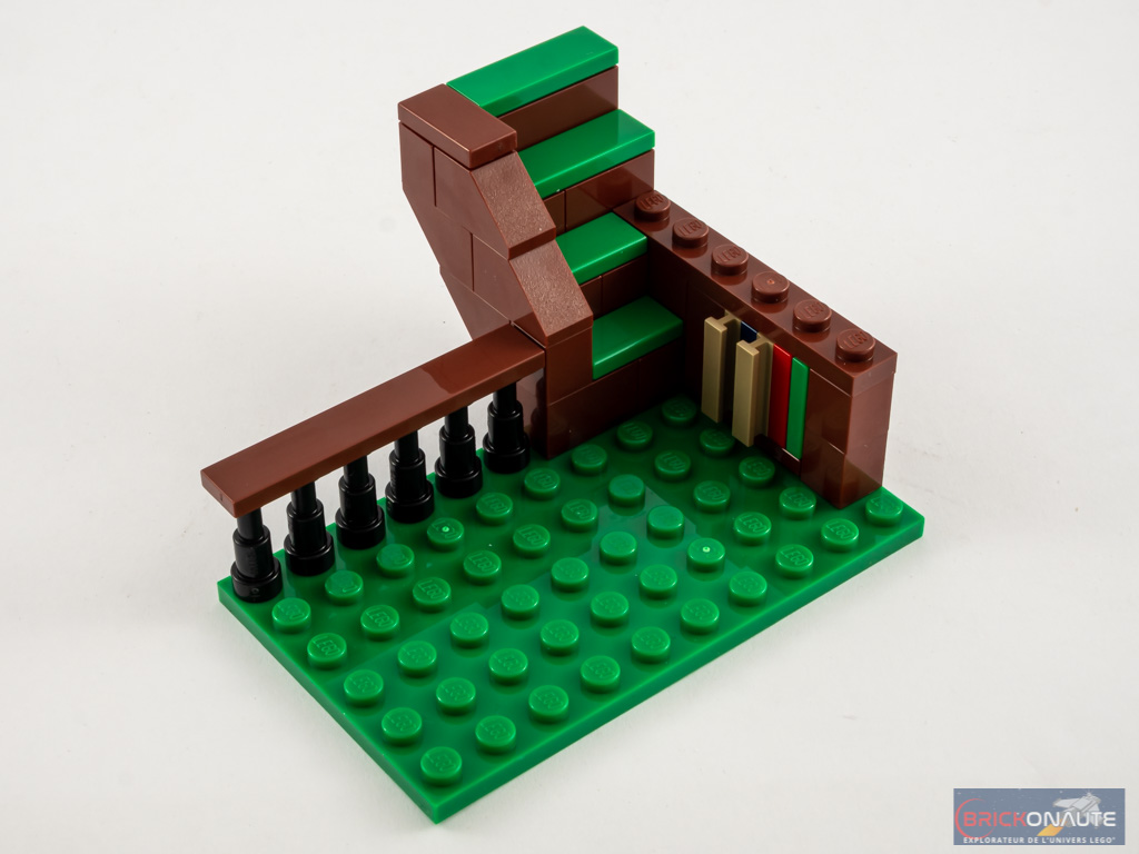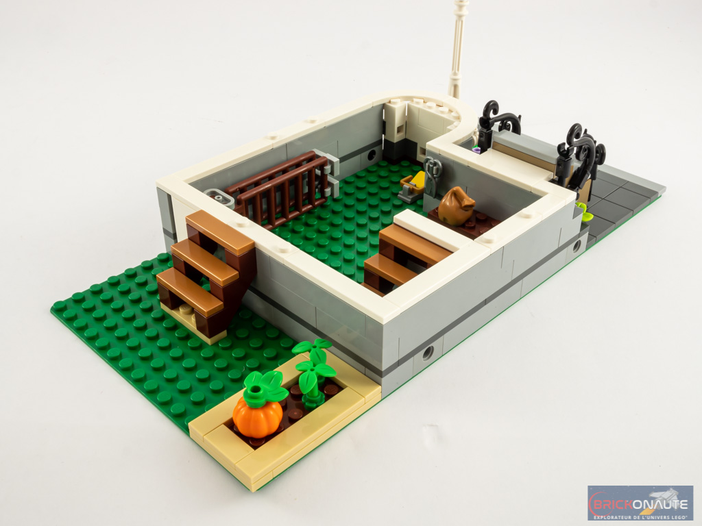 Nous nous emparons de la 2ème plaque de base verte et attaquons alors la maison, deuxième bâtiment de notre modular. Et on ne change pas des bonnes habitudes : on commence par « paver » le sol – si ce n’est qu’ici nous ne nous occupons que du trottoir. La maison dispose en effet d’un sous-sol. On élève quelques rangées de briques avant de construire le sublime escalier d’entrée, constitué de deux morceaux principaux qui s’assemblent à la perfection. C’est une petite merveille comme on aime les voir dans la gamme Creator Expert. On aménage l’intérieur du sous-sol avec un établi, une tapette à souris et un escabeau, et un escalier d’accès vers le rez-de-chaussée. Côté jardin, on aménage un petit potager.