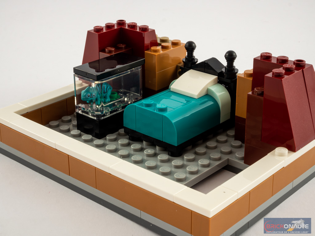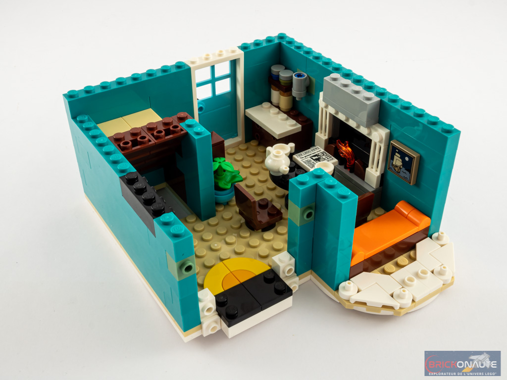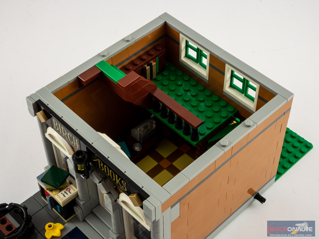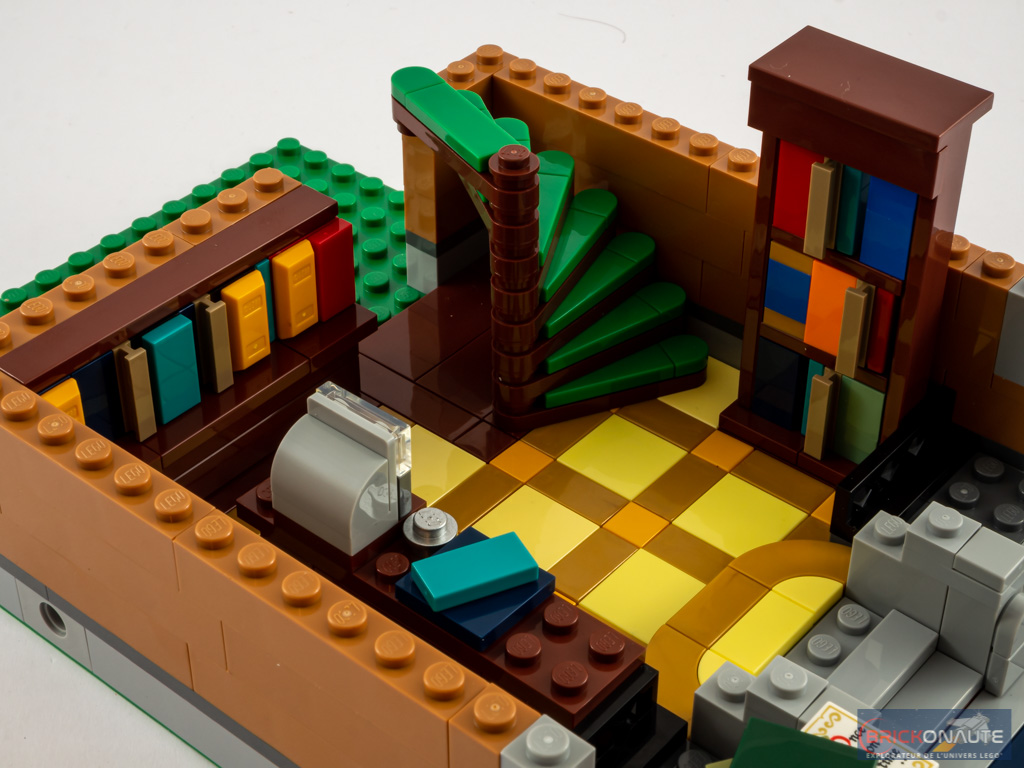 Au niveau du mobilier c’est également du tout bon. Les meubles sont très variés, depuis les bibliothèques de la librairie jusqu’au lit de la maison, sans oublier la superbe cheminée. Comme souvent, ces petits éléments sont autant d’occasions pour le designer d’utiliser les pièces LEGO de manière inventive afin d’arriver au design souhaité. Un petit regret néanmoins pour la librairie : elle ne dispose que d’un seul vrai livre, les autres étant de simples plates et tiles disposées dans les bibliothèques.