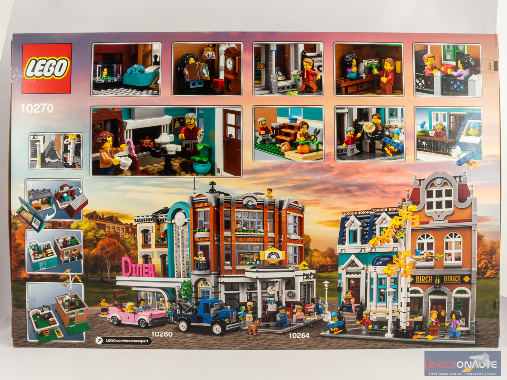 Au dos, le set est présenté aux côtés de deux autres bâtiments modulaires, les références 10260 Downtown Diner et 10264 Corner Garage. De nombreuses vignettes nous montrent quelques uns des détails présents dans les deux bâtiments de notre set.