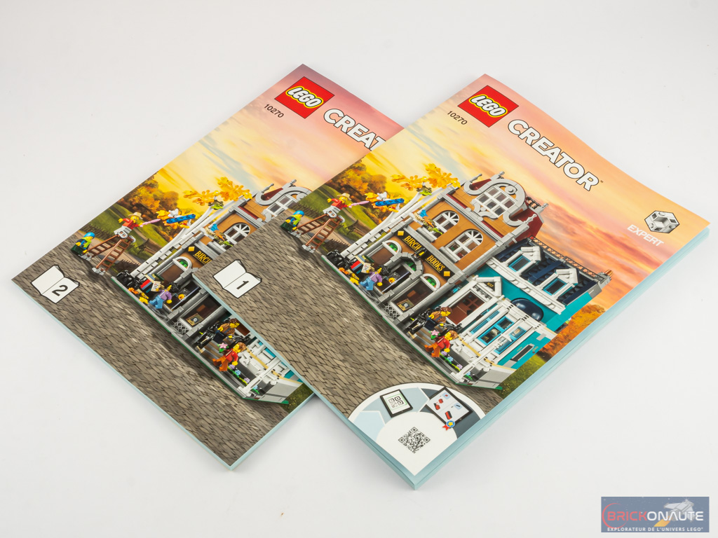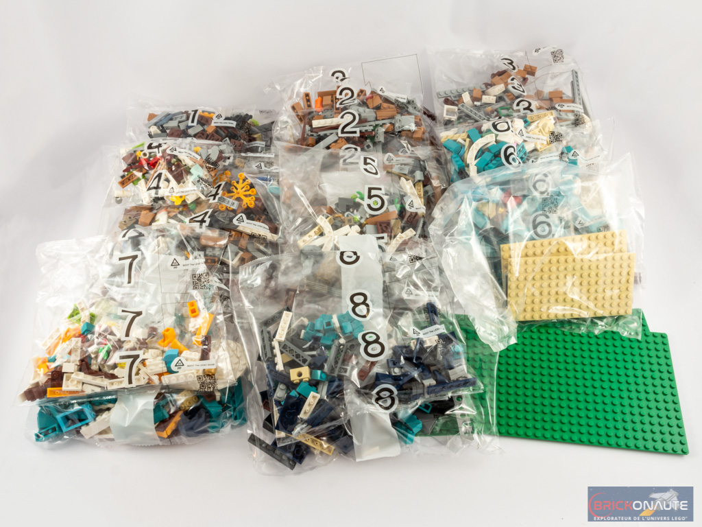 A l’intérieur, nous trouvons 18 sachets de pièces numérotés de 1 à 8, un 19ème sachet non numéroté et deux baseplates vertes de 16 x 32 tenons. Nous avons également 2 notices d’instructions (116 et 100 pages), une par bâtiment. On pourra donc partager la construction avec quelqu’un… ou pas !