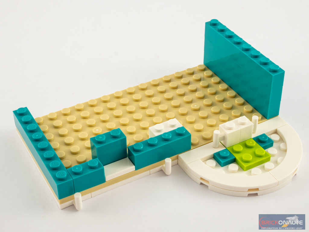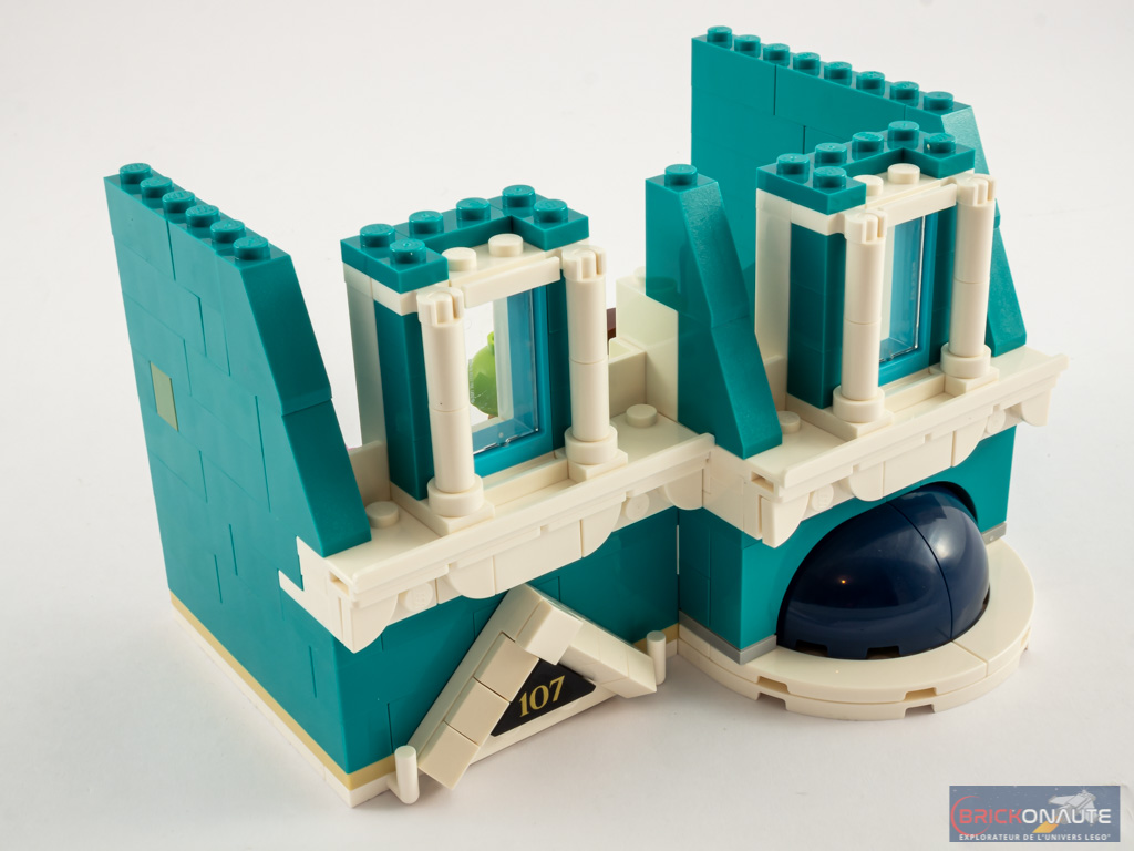 Le niveau supérieur est assemblé par moitié, on commence avec le côté façade. Un demi dôme bleu surplombe le bow-window, et un triangle blanc fixé sur une turntable porte le numéro de rue. Remarquez ici également les pièces courbées, fixées à l’envers au-dessus du demi-dôme grâce à des clips. Côté intérieur, on assemble un grand (et joli) lit, et une commode avec des tiroirs, une lampe et un pot de fleurs. On continue alors d’élever les murs, et on ajoute les deux petites fenêtres avant de passer à l’étape suivante.