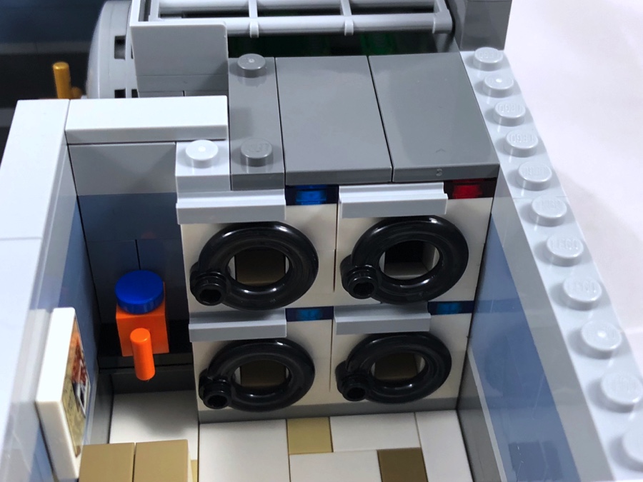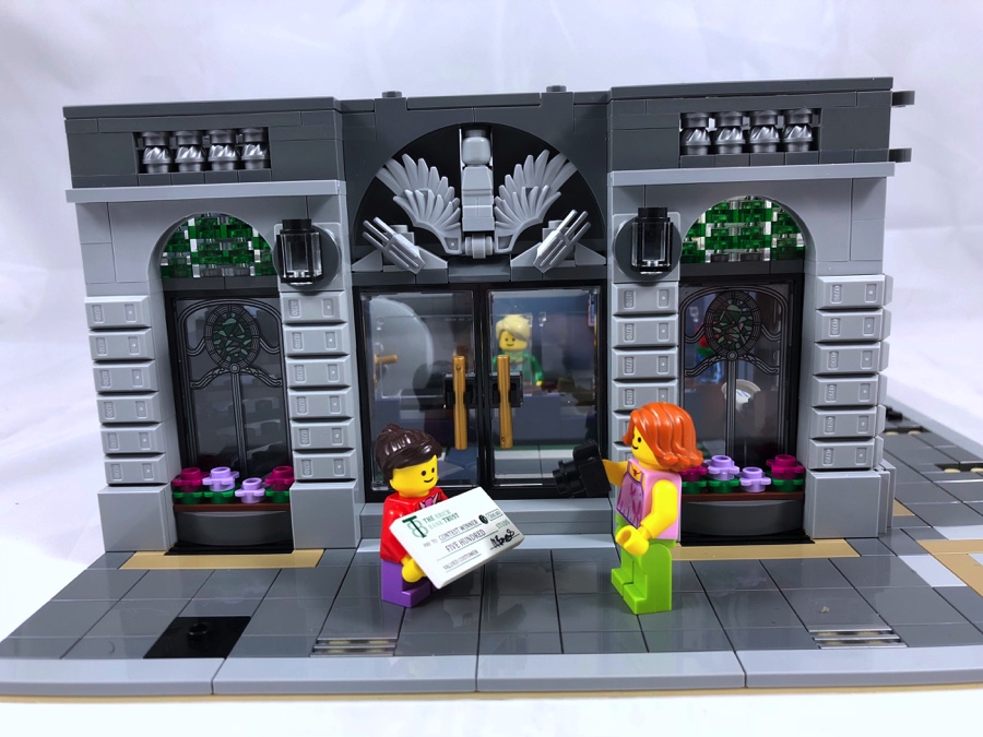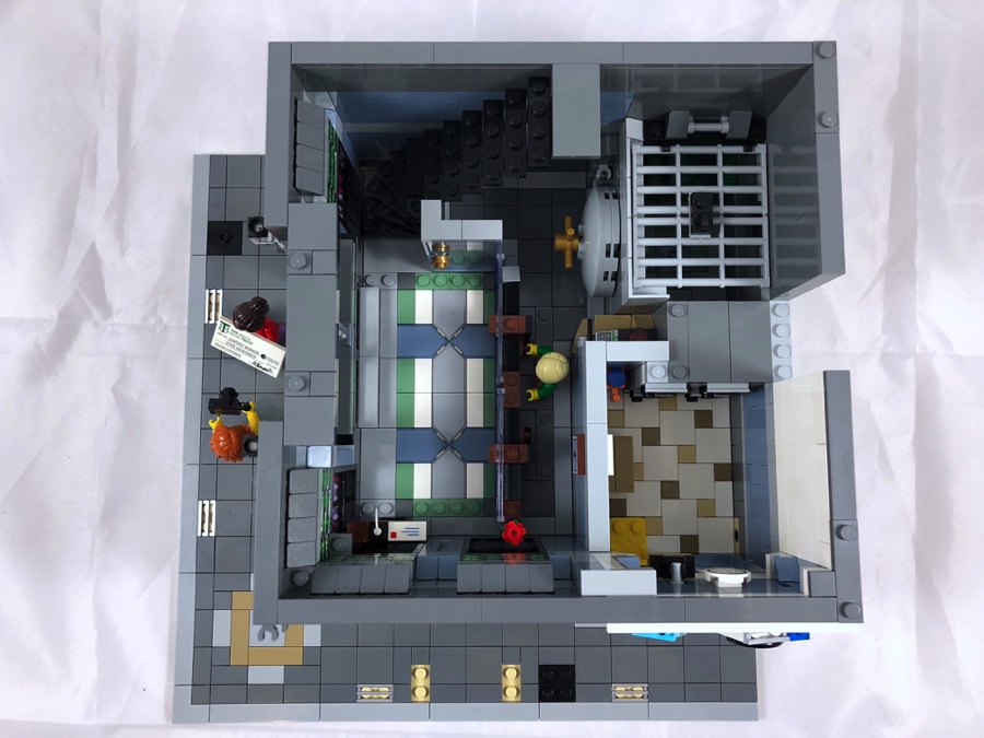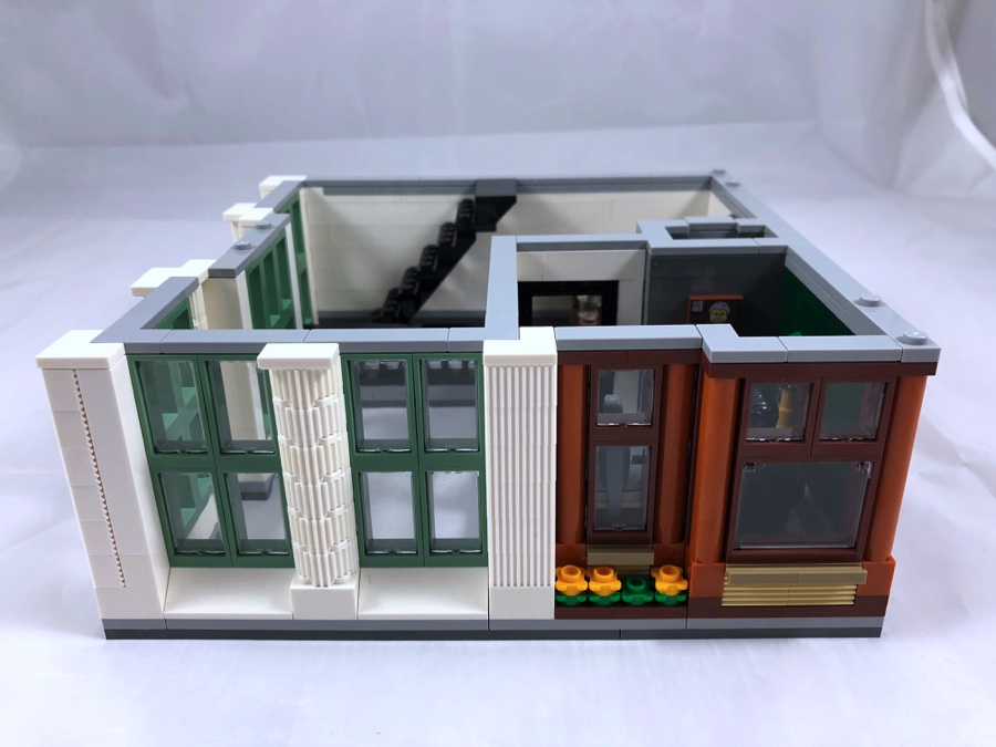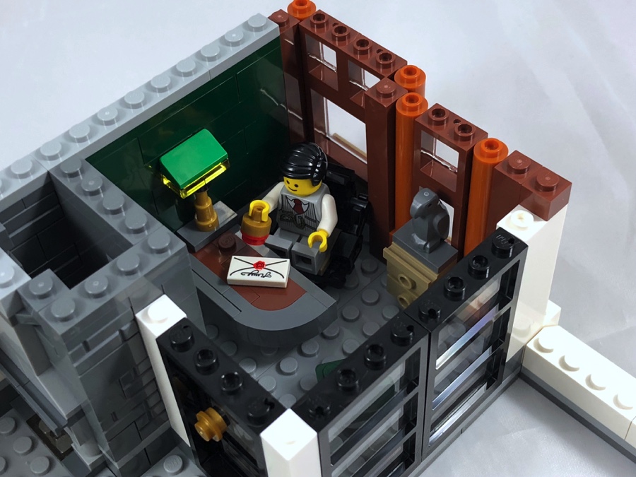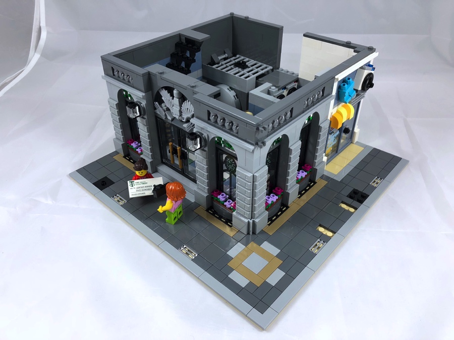 Par comparaison avec les autres bâtiments modulaires, ce qui marque lors de la construction de ce set c’est les couleurs plutôt neutres utilisées (hormis pour la blanchisserie et le bureau à l’étage). Le moins que l’on puisse dire c’est que par ce choix, la banque « tranche » réellement avec les autres sets de la gamme. C’est un parti pris des designers, mais personnellement j’aurais aimé un peu plus de fantaisie. Cet écueil est amplement rattrapé par les diverses techniques de construction apportant des reliefs variés à la façade et ça, c’est très réussi.