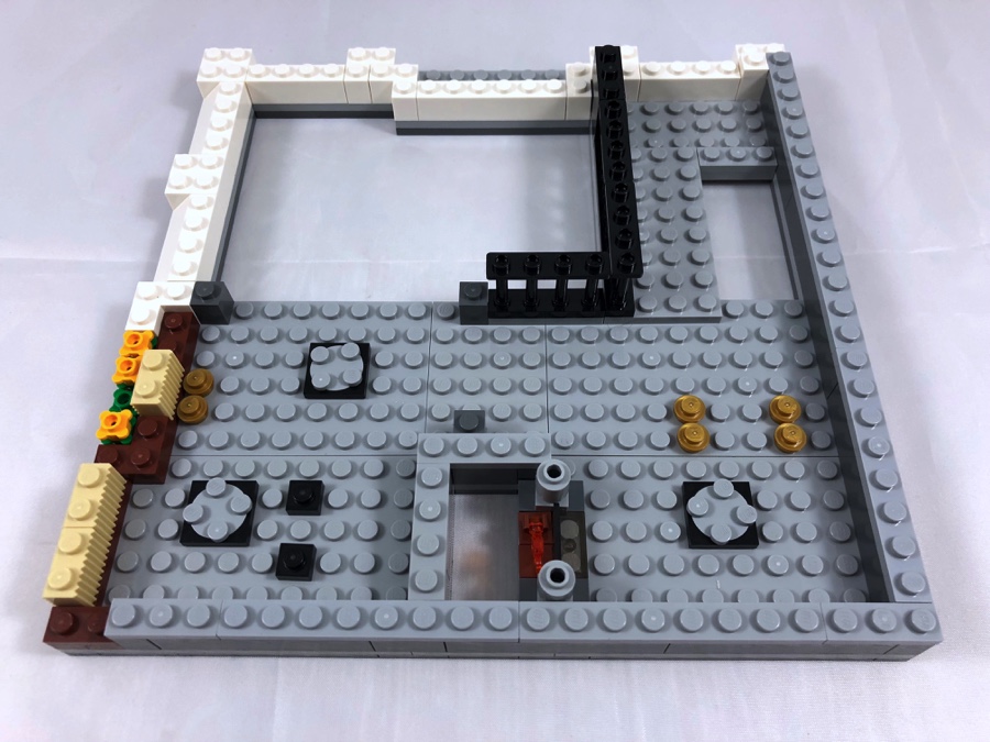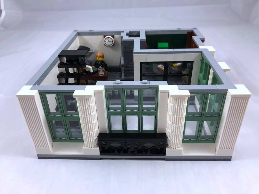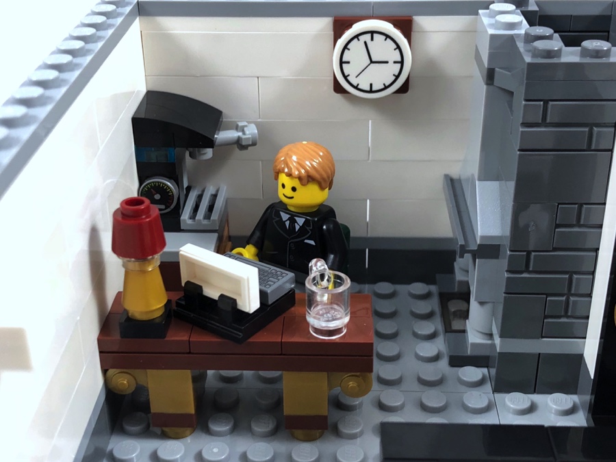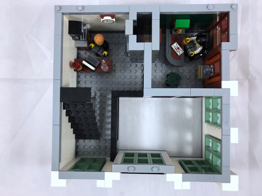 On construit ensuite la cheminée avec sa petite flamme, et on démarre l’élévation des murs avant d’ajouter quelques pièces de mobilier. On trouve à cet étage un bureau avec un fauteuil cossu et une statue de perroquet située derrière ; et un autre avec un meuble à tiroirs surmonté d’une machine à café, une chaise nettement moins confortable, une lampe de bureau et une machine à écrire. Le hall de la banque occupant une grosse partie de cet étage également, les pièces qui le constituent sont plutôt petites.