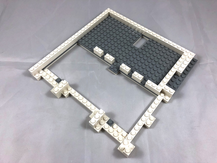 L’expérience de construction apportée par chacun des modèles de la gamme des bâtiments modulaires est sans conteste ce qui pousse toujours à acheter le suivant. Sur la plaque de base beige, on commence par réaliser le pavage de la surface, et on commence à deviner les différentes parties du bâtiment : le hall de la banque, le comptoir, le coffre et la blanchisserie. On notera la présence de boucliers de la gamme Nexo Knights sur le sol. Côté blanchisserie, l’assemblage de dalles blanches, et de plus petites couleurs tan et dark tan est également superbe.