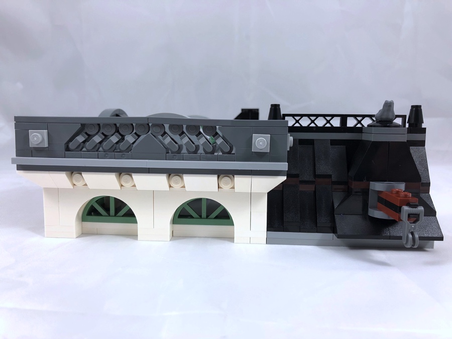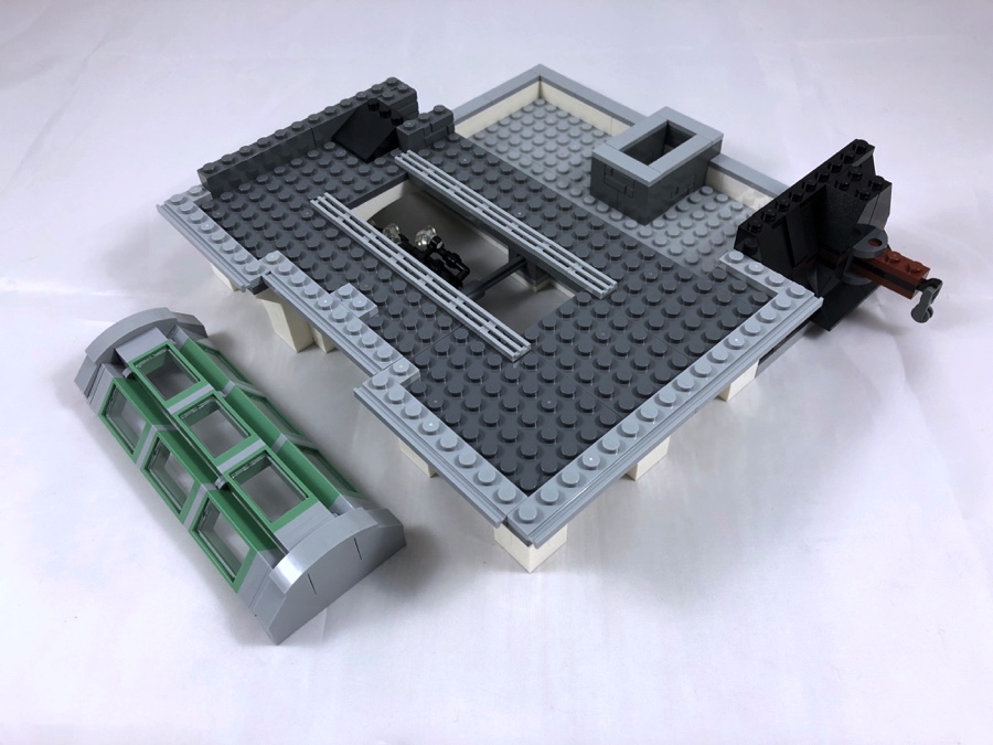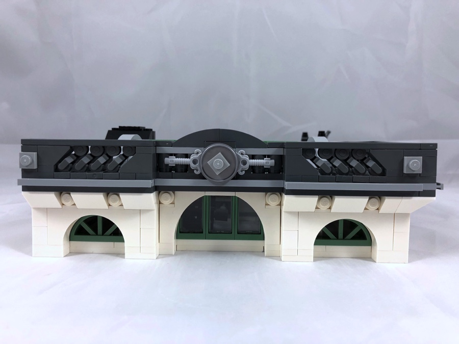 On construit ensuite la partie du toit qui couvre le hall de la banque. Il se compose, comme l’étage inférieur, d’une verrière semi-cylindrique réalisée avec des cadres de fenêtres couleur sand green. On notera, sous les tiles qui composent la corniche, l’utilisation de poignées de tyrolienne (!), ainsi que de clés de la gamme LEGO Elves.