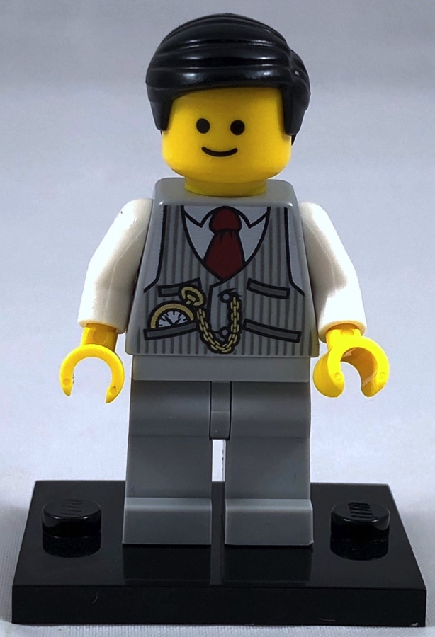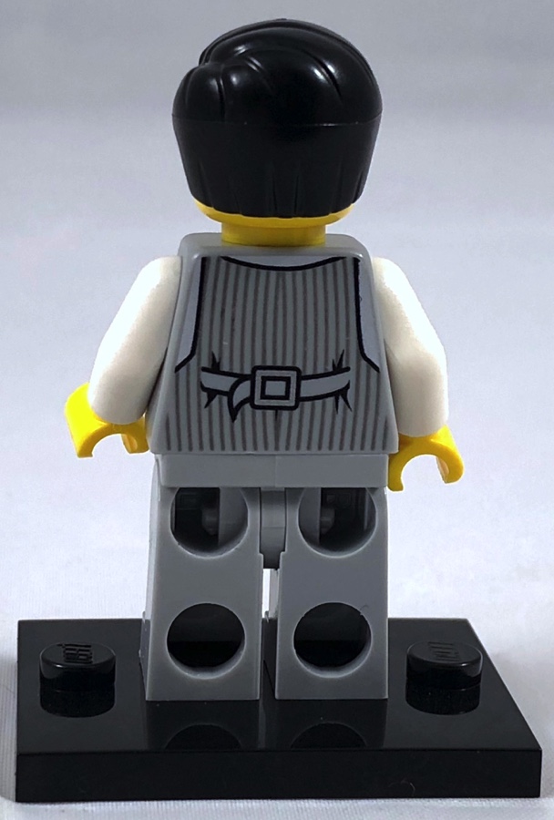 Le directeur de banque porte un gilet gris rayé, avec une montre à gousset dans la poche, le tout au dessus d’une chemise blanche avec une cravate rouge. L’arrière du gilet est également joliment tampographié. Le pantalon est monochrome, couleur dark bluish gray.