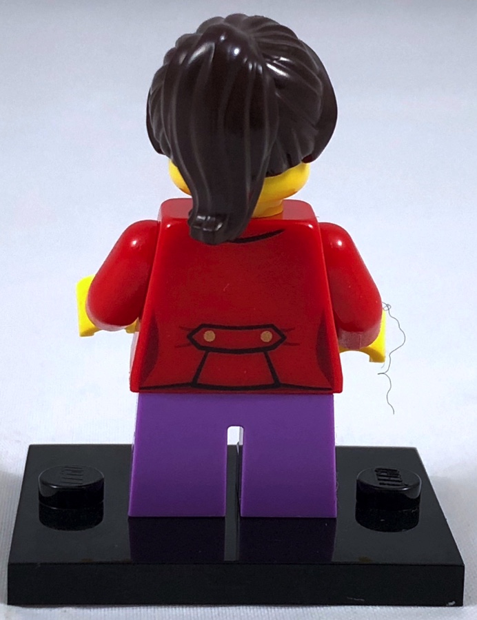 La mère porte un pantalon vert clair, et un débardeur rose avec des motifs de fleurs et de papillons. Autour du cou, on trouve un pendentif en forme de coeur. Logiquement, l’arrière du torse est également tampographié. A noter qu’on voit ce personnage maintes et maintes fois mis en scène sur la boîte du set, notamment en train de prendre de nombreuses photos à l’intérieur de la banque. Elle est livrée avec un bonnet et un bandana, qui permettent de la transformer en voleuse professionnelle.