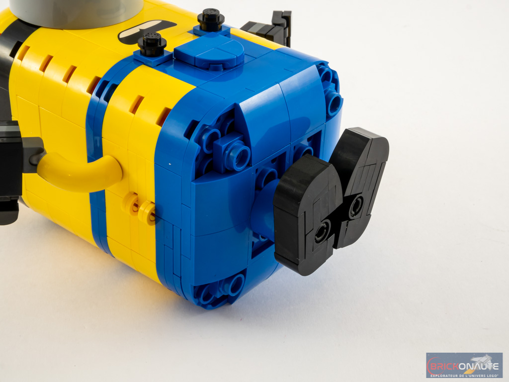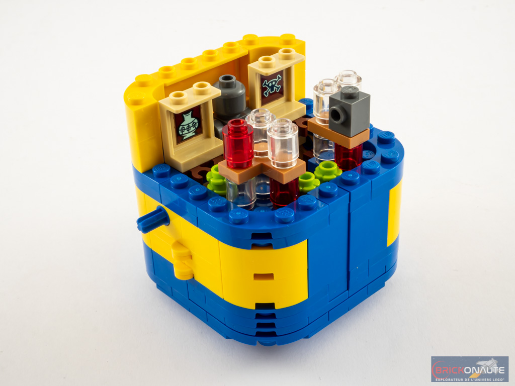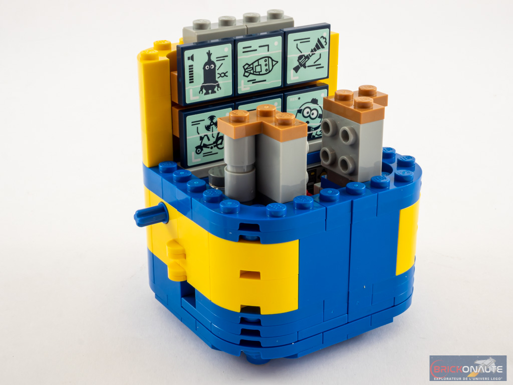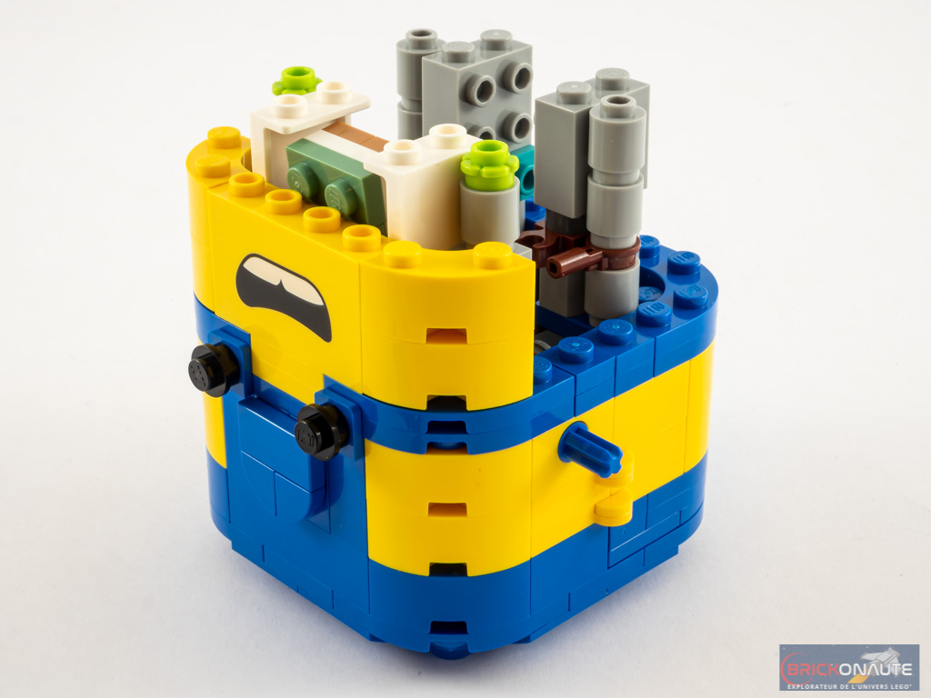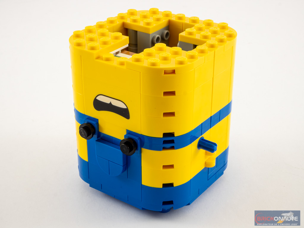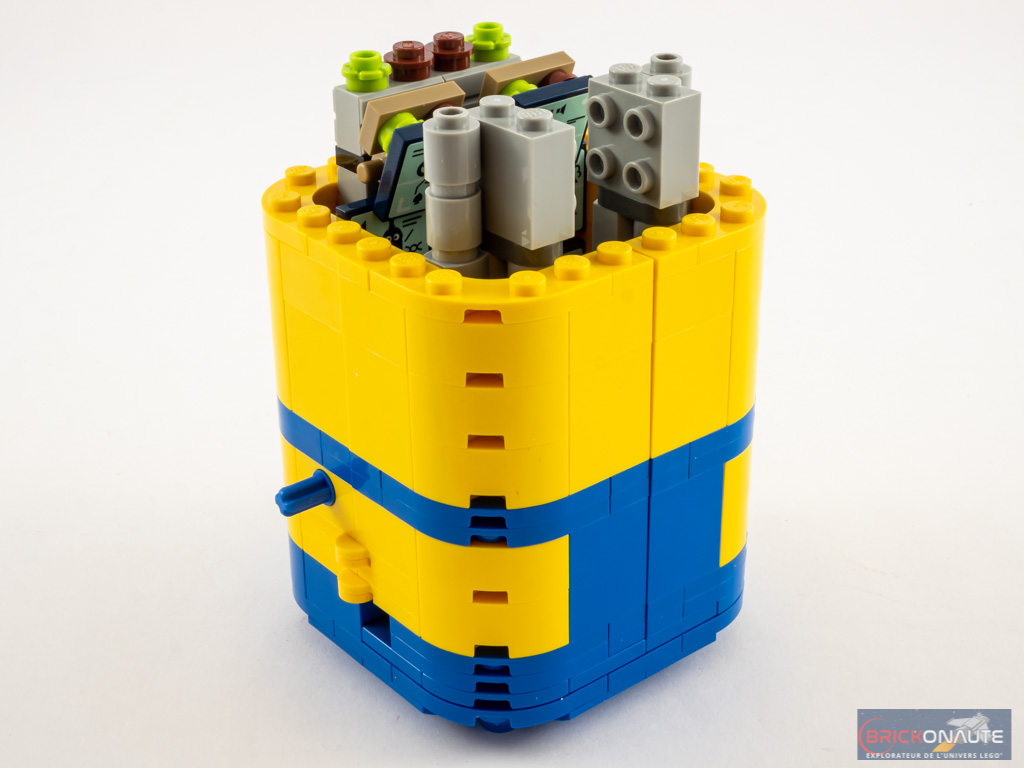 Côté extérieur (c’est d’ailleurs ce qui m’avait choqué la première fois – alors que je ne savais pas que l’intérieur était aménagé) il en résulte un aspect carré aux bords arrondis, plutôt que la forme cylindrique caractéristique des Minions. Cette forme était difficile, pour ne pas dire impossible, à reproduire avec des éléments LEGO existants tout en gardant cette possibilité d’ouvrir les figurines. Et je trouve qu’à ce titre le compromis est très acceptable.