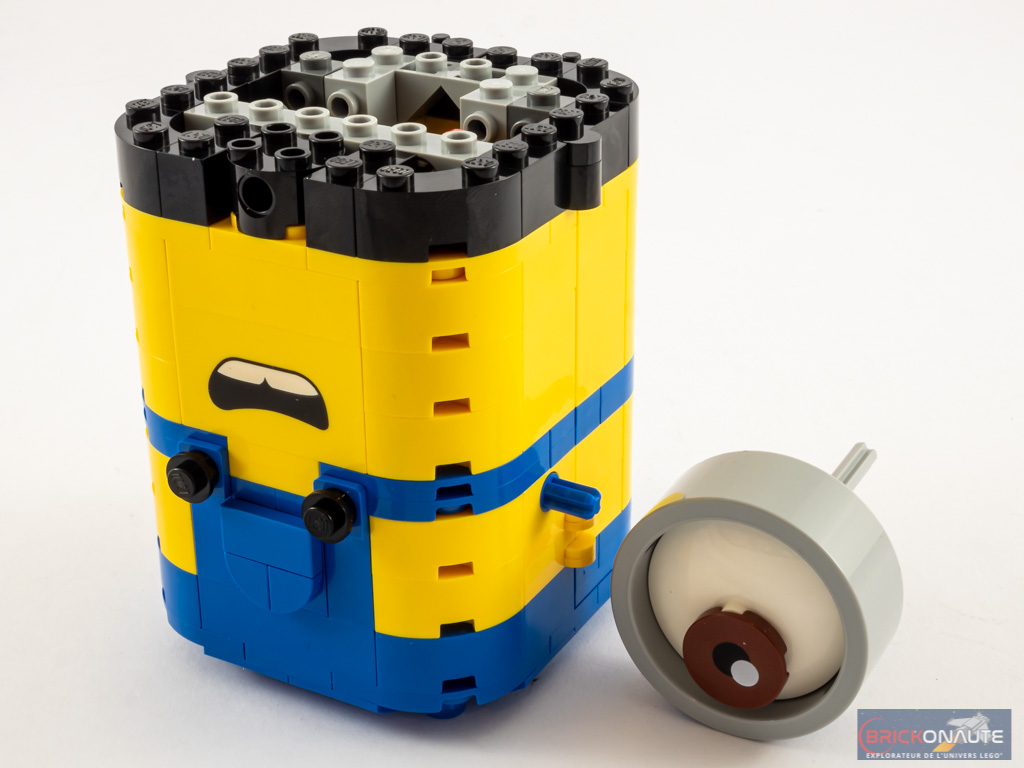 Voulant vous présenter les 3 personnages, j’ai fini par démonter Bob pour pouvoir construire Kevin. En faisant attention, il est tout à fait possible de conserver de nombreux éléments afin de construire un autre personnage : la base avec les pieds, les deux mains, les yeux avec leur système de rotation… : la reconstruction n’est donc pas très longue.