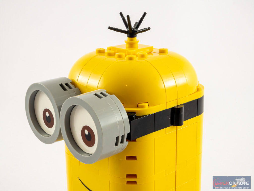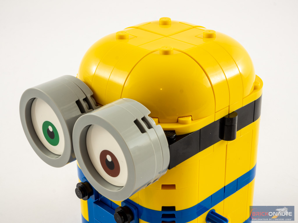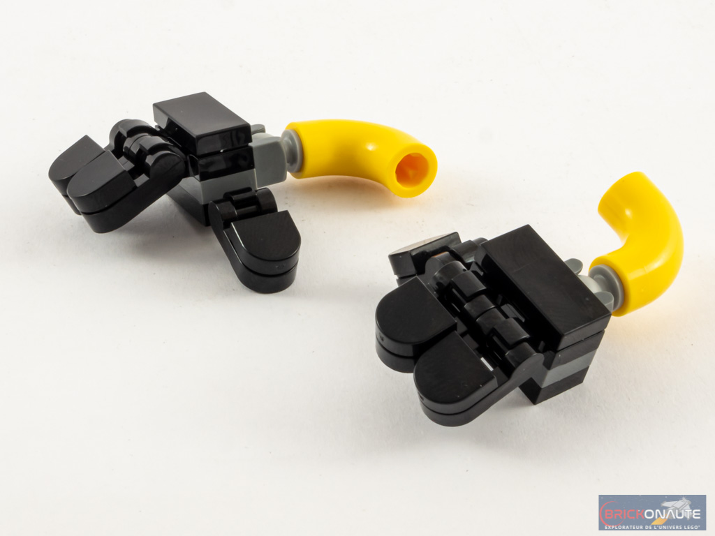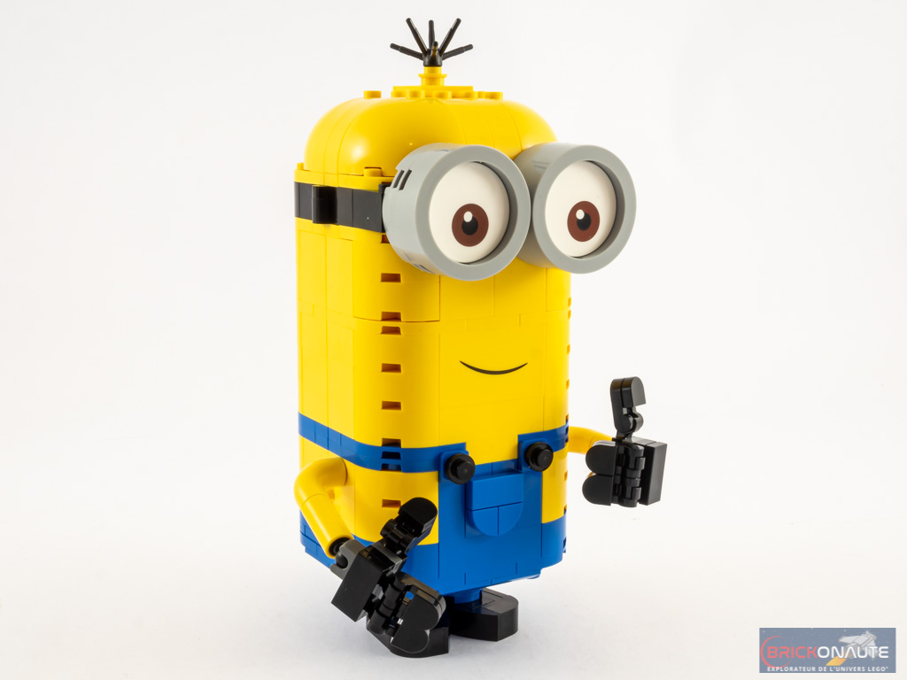 Le design général est réussi, chacun des personnages étant identifiables par ses quelques caractéristiques : les yeux vairons de Bob, l’oeil unique de Stuart ou la grande taille de Kevin avec sa petite touffe de cheveux. Le corps et les pieds sont identiques entre les 3 personnages, à l’exception des bras de Kevin un peu plus longs que ceux de ses copains. Notez d’ailleurs que les bras sont fixés sur des pins Technic et que les mains sont articulées sur des ball joints : il est donc possible d’orienter tout cela comme on le souhaite.
