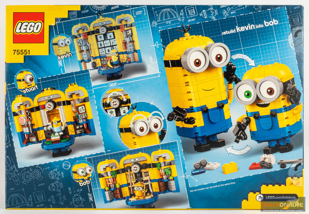Au dos, on apprend qu’il est possible de démonter Kevin pour construire Bob, on choisira donc son préféré. 3 vignettes nous montrent l’intérieur de chacune des minifigs, tandis qu’une 4ème nous présente la principale « fonctionnalité » du modèle : une molette, située à l’intérieur, permet de faire tourner les yeux.
