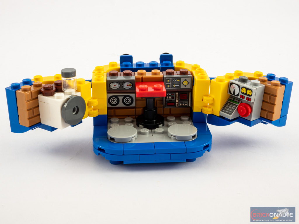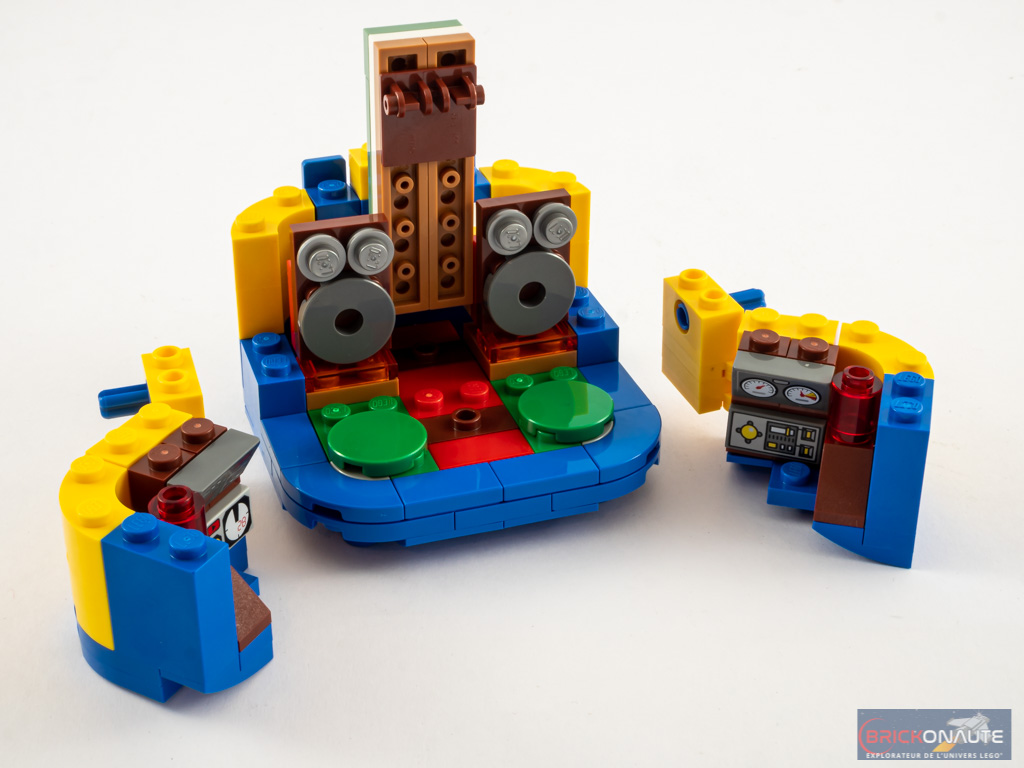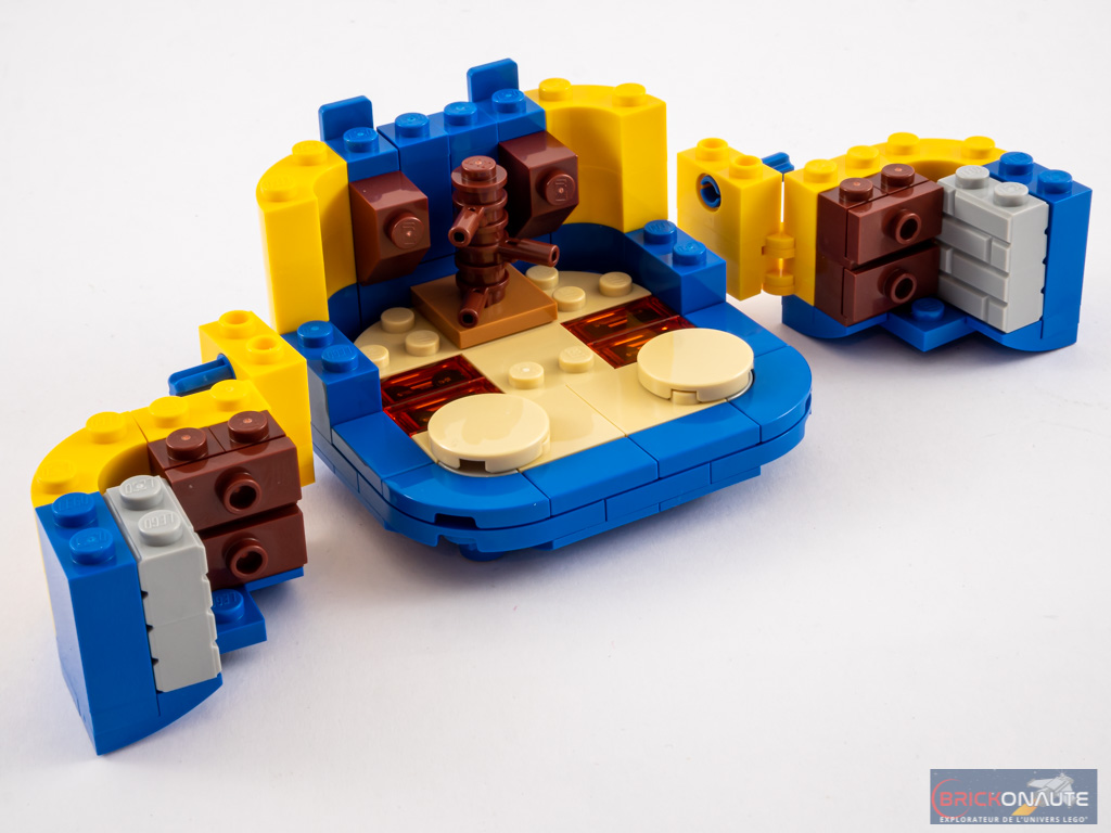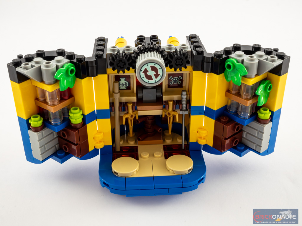 Pour Kevin, c’est un laboratoire / salle de contrôle, pour Bob une salle de kung-fu et pour Stuart, tout simplement sa chambre. Sa minifig est d’ailleurs en pyjama ! L’aménagement intérieur de chacune des maxi-figurines est vraiment riche et regorge d’accessoires, un très bon point pour la jouabilité. On notera également une fonctionnalité rigolote : il est possible de faire tourner les yeux, en actionnant une molette située à l’intérieur de chacun des personnages.