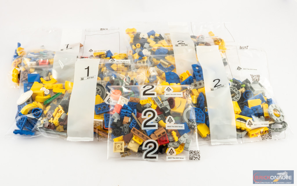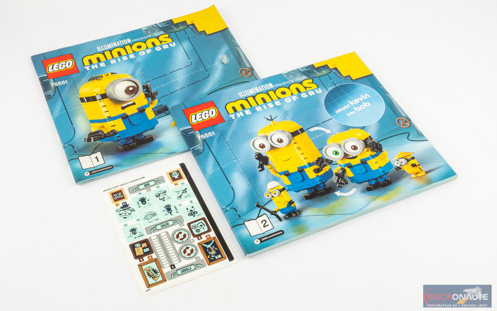 A l’intérieur, nous trouvons 5 sachets de pièces, 2 portant le numéro 1, et 3 le numéro 2. Nous avons également deux notices d’instruction, la première permettant la construction de Stuart, et la seconde proposant de choisir entre Kevin et Bob. Enfin, LEGO nous livre dans ce set une planche de 21 autocollants.
