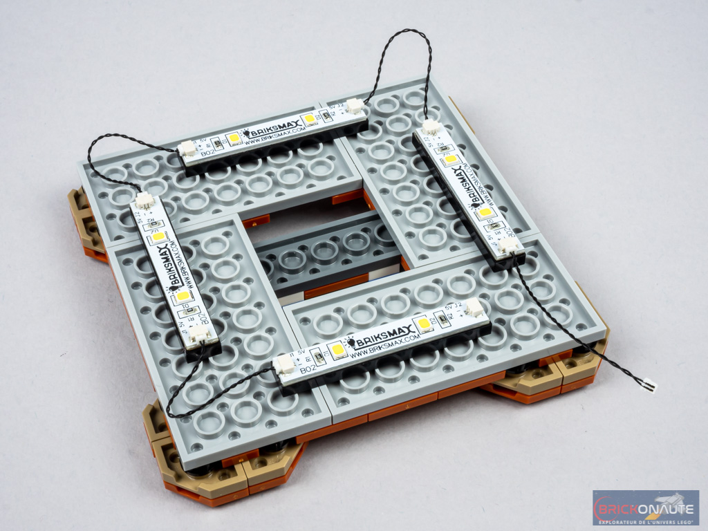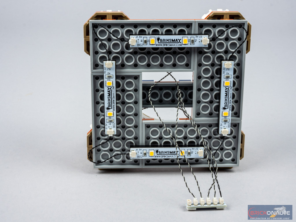 Les câbles et les LEDs sont suffisamment fins pour s’insérer entre les éléments LEGO. Hormis pour le dôme où il était impossible de cacher le câble à l’intérieur, le système est quasi invisible une fois l’assemblage terminé. Notez ici que les 4 rampes situées sous le dôme sont à coller sur les plates LEGO situées à cet endroit – alors que le kit estampillé Lightailing propose des rampes de LED déjà intégrées dans des pièces LEGO fournies pour l’occasion. L’avantage en revanche du kit Briksmax, c’est qu’il est « modulaire » et donc adaptable à d’autres constructions.
