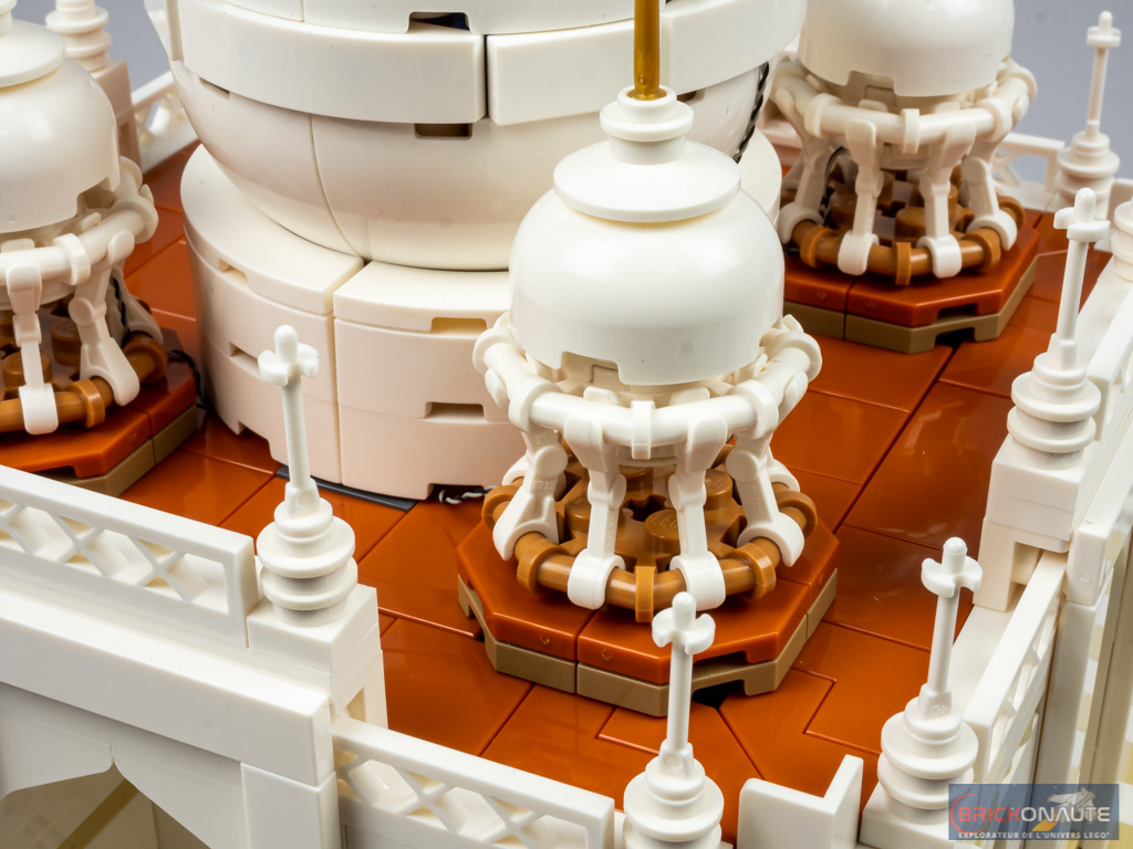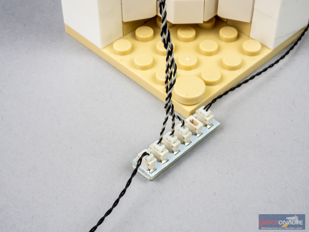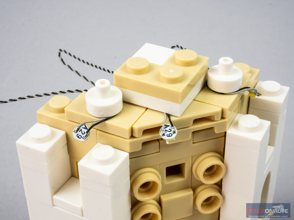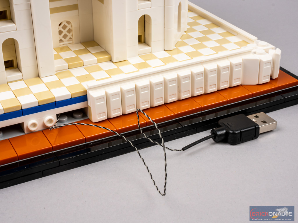On retrouve avec ce kit le principal « défaut » que j’avais pu mentionner lors de mon précédent test. Le set LEGO Architecture 21056 Taj Mahal est prévu pour être décomposé en 3 morceaux : la partie basse du bâtiment, sa toiture, et la salle des cénotaphes. Ici il va falloir oublier : les câbles relient ces différents éléments entre eux. Et même si la notice d’assemblage ne le précise pas, j’ai dû retirer la salle des cénotaphes pour faire entrer le câblage à l’intérieur sans avoir la toiture qui se soulève légèrement.