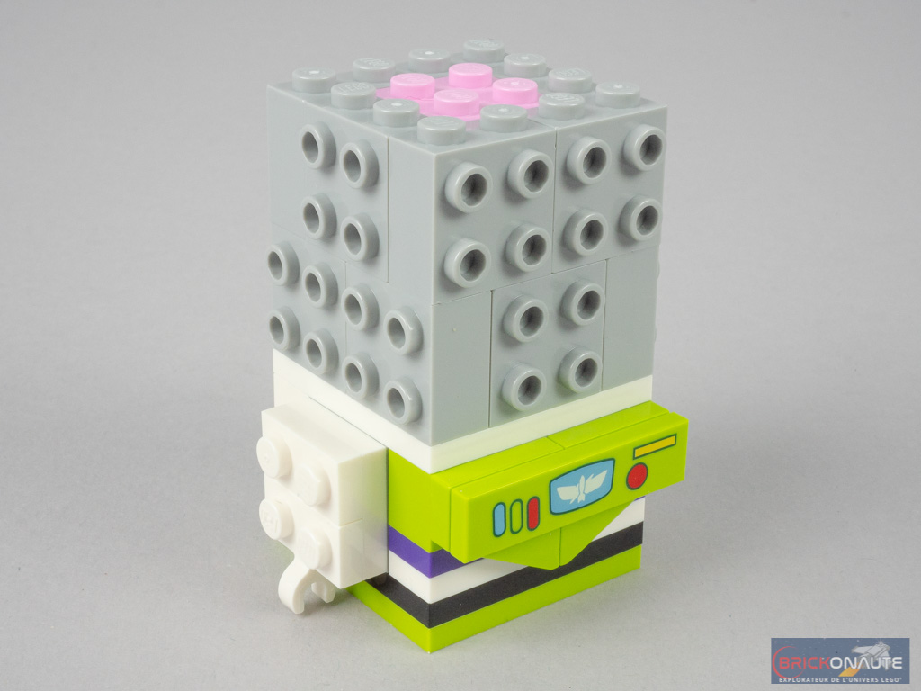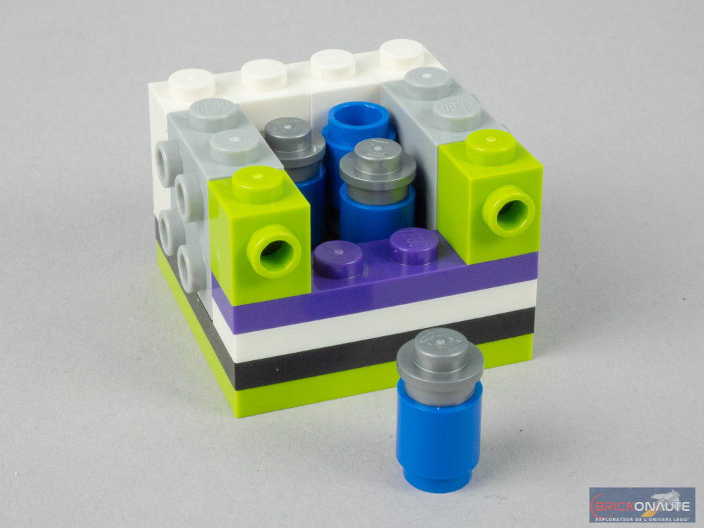 L’assemblage le plus intéressant, même s’il n’est pas révolutionnaire, est le jetpack. Les deux ailes et leurs lumières rouge et verte viennent se clipser dans le dos de Buzz. On termine la construction avec l’habituel socle d’exposition noir.
