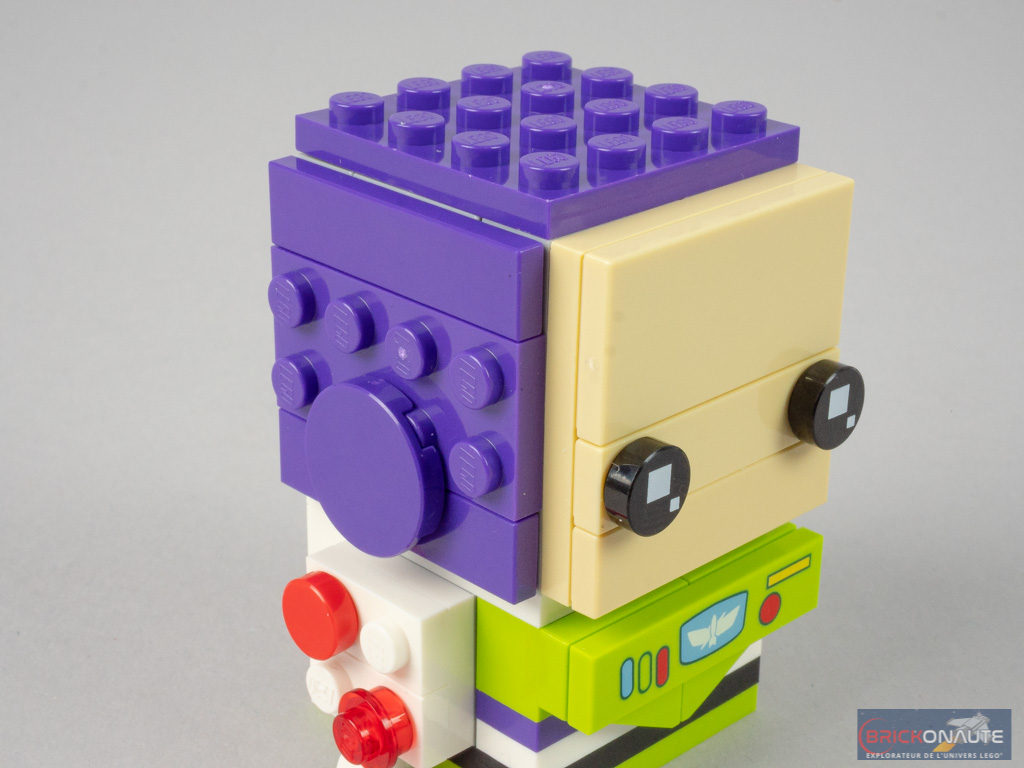 LEGO a choisi de nous proposer un Buzz l’éclair avec les ailes déployées, mais sans sa visière transparente refermée au-dessus du visage – un choix un peu étrange lorsque le personnage referme précisément cette visière lorsqu’il déploie ses ailes. Aurait-il fallu alors faire une tête plus petite et une visière transparente au-dessus et déroger aux règles habituelles de la gamme ? Ou au contraire une tête comme les autres mais une visière qui dépasse légèrement ? Quoi qu’il advienne, je trouve qu’il y avait ici mieux à faire. Et faire surtout un choix : les ailes et la visière, ou rien du tout (ou la possibilité de faire les deux !).
