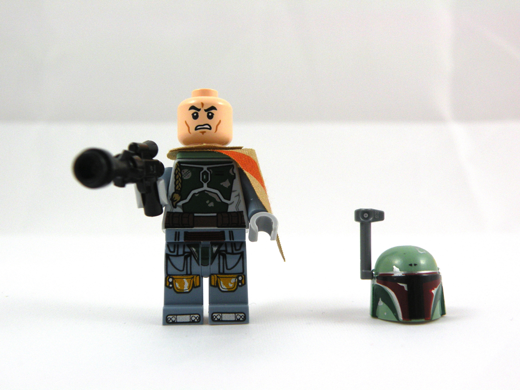 C’est une combinaison des sets 9496 Desert Skiff (pour le casque, le torse et le jetpack) et du set 75060 Slave I pour la cape et les jambes qui nous est servie ici. Ça fonctionne plutôt bien, tous les éléments sont hyper détaillés, depuis le casque avec son antenne jusqu’aux jambes tampographiées jusqu’au bout des pieds, bref, une belle réalisation.