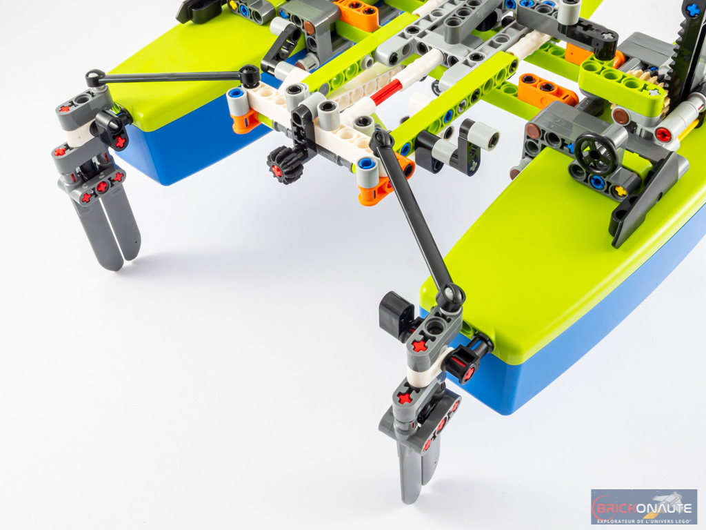 Comme c’est souvent le cas dans la gamme LEGO Technic, l’accent a été mis sur les fonctionnalités plutôt que sur le design. Et avec (seulement) 400 pièces, il était difficile d’en proposer beaucoup plus : un engrenage en guise de barre actionne les deux gouvernails, deux manivelles (une de chaque côté) permettent d’orienter chacune des voiles, et deux autres manivelles permettent de monter et descendre les foils qui passent au travers des coques. Ces quelques fonctionnalités permettent de s’initier aux grands principes de fonctionnement d’un voilier, et c’est déjà pas mal.