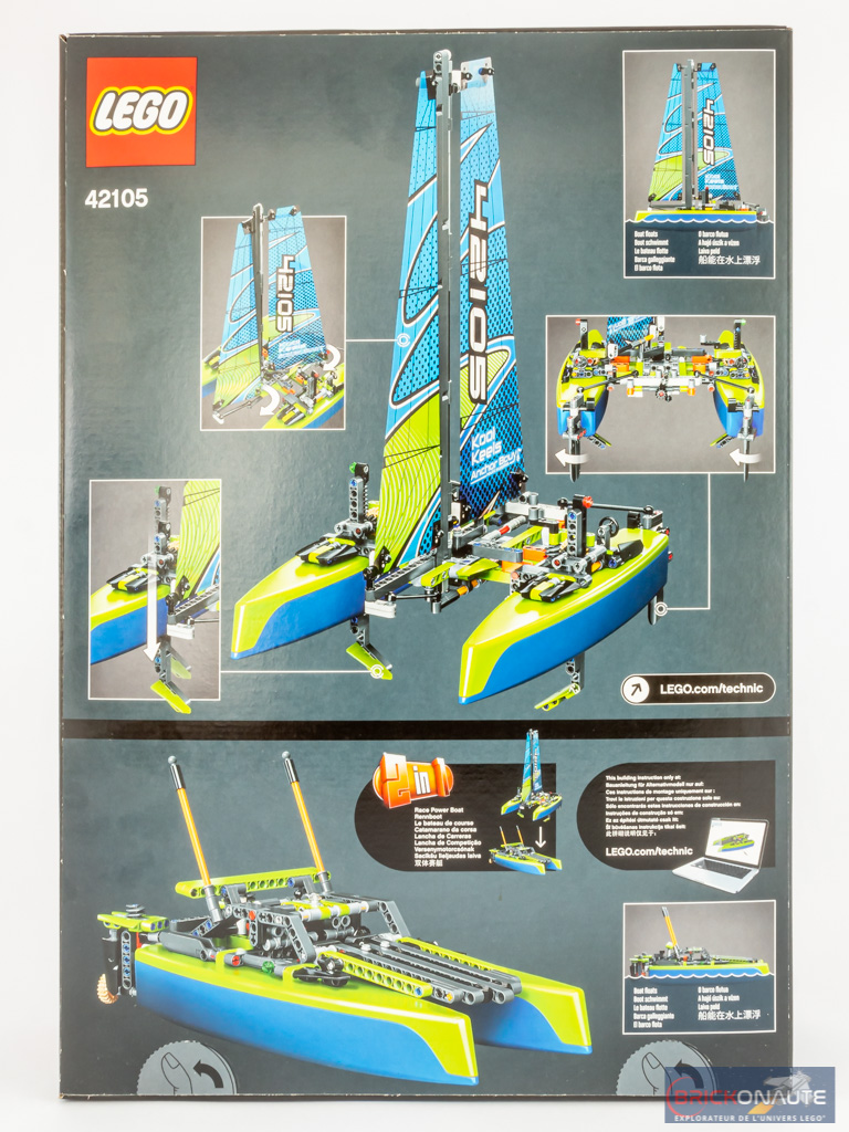 Sur la face avant de la boîte, présentée pour l’occasion au format « portrait’, le bateau s’élève légèrement au-dessus de la mer grâce à ses foils et semble à pleine vitesse. Un petit encart nous précise que le modèle LEGO est prévu pour flotter. Au dos, dans la partie supérieure, notre catamaran est vu depuis l’avant tandis que quelques vignettes nous montrent les principales fonctionnalités du modèle. Le modèle secondaire, un bateau à moteur, nous est présenté dans la partie inférieure. Les instructions pour ce second modèle ne sont pas fournies dans la boîte et il faudra les télécharger sur internet.