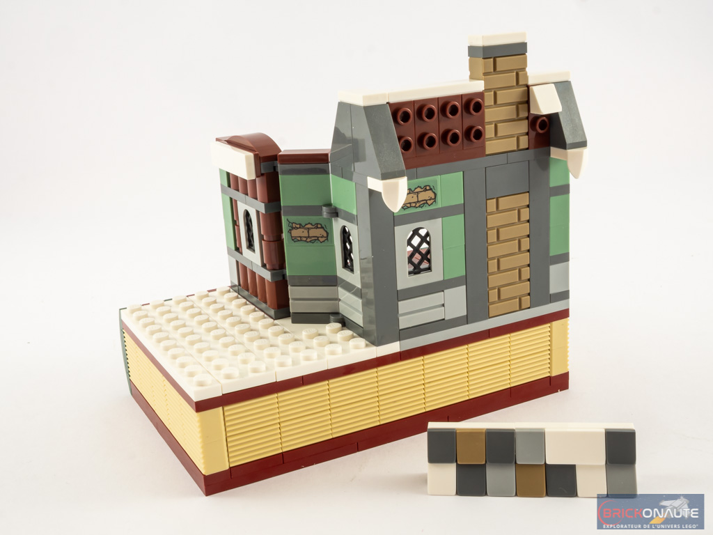 Comme on le ferait pour un set plus conséquent, nous « tapissons » alors la couverture du livre : côté extérieur, des plates blanches pour la neige, et côté intérieur l’âtre et les lattes du parquet (des autocollants). Nous passons alors aux murs : un premier avec la cheminée, et un second en 3 parties reliées entre elles par des charnières. Nous achevons ces murs avec leur partie supérieure, qui reçoivent des briques SNOT qui serviront ensuite à décorer le côté extérieur.