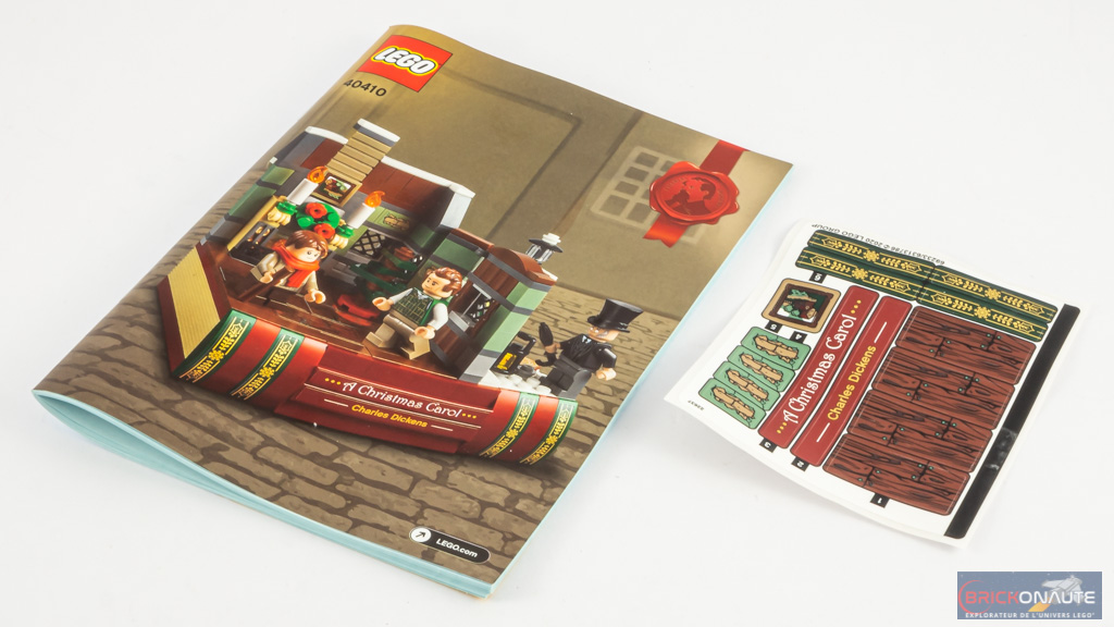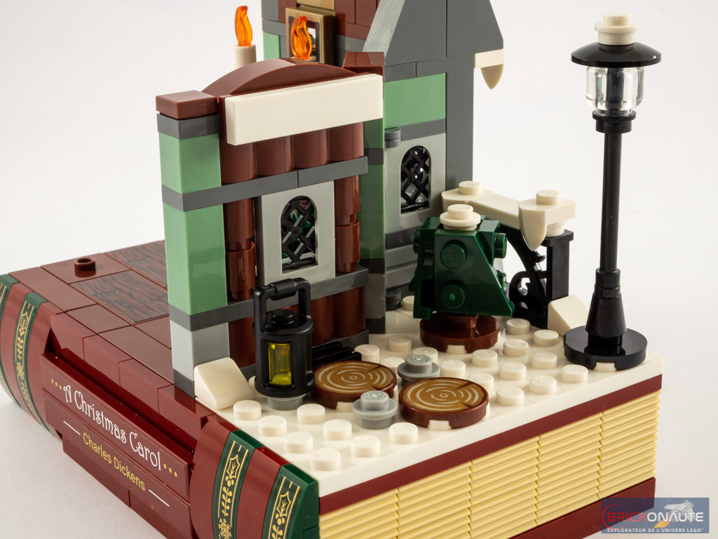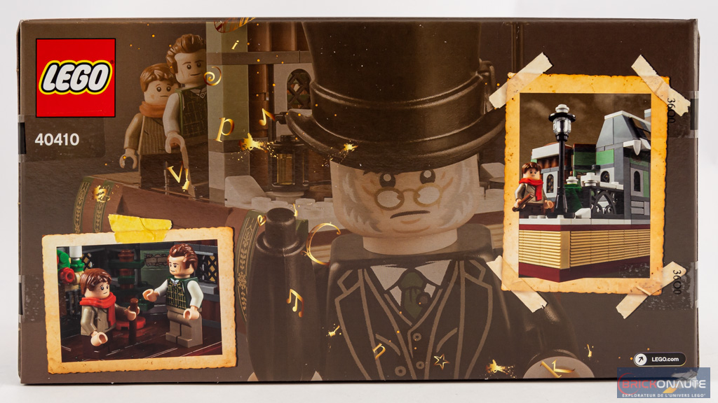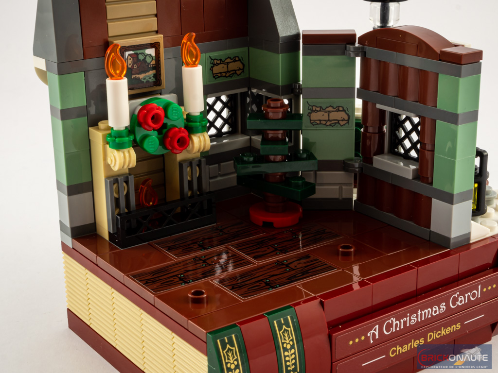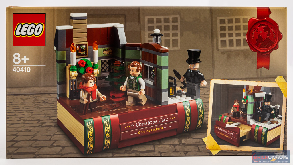 La boîte est assez imposante pour un cadeau offert sous conditions d’achat. Il faut dire que ce petit set compte tout de même 325 pièces. Notre set est mis en scène sur les pavés d’une rue londonienne, Bob et Tim Cratchit étant à l’intérieur de la maison tandis que Scrooge les observe depuis l’extérieur. Dans le coin inférieur droit, une vignette nous montre que le livre contient en fait un tiroir.