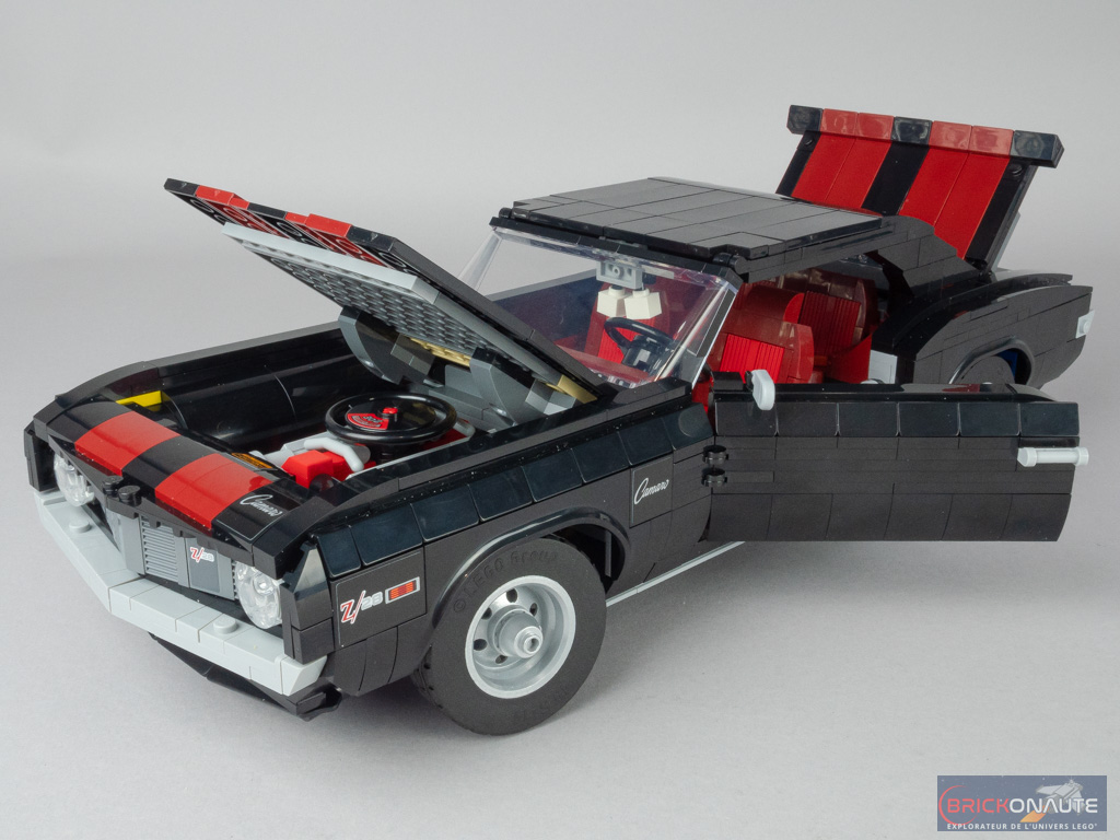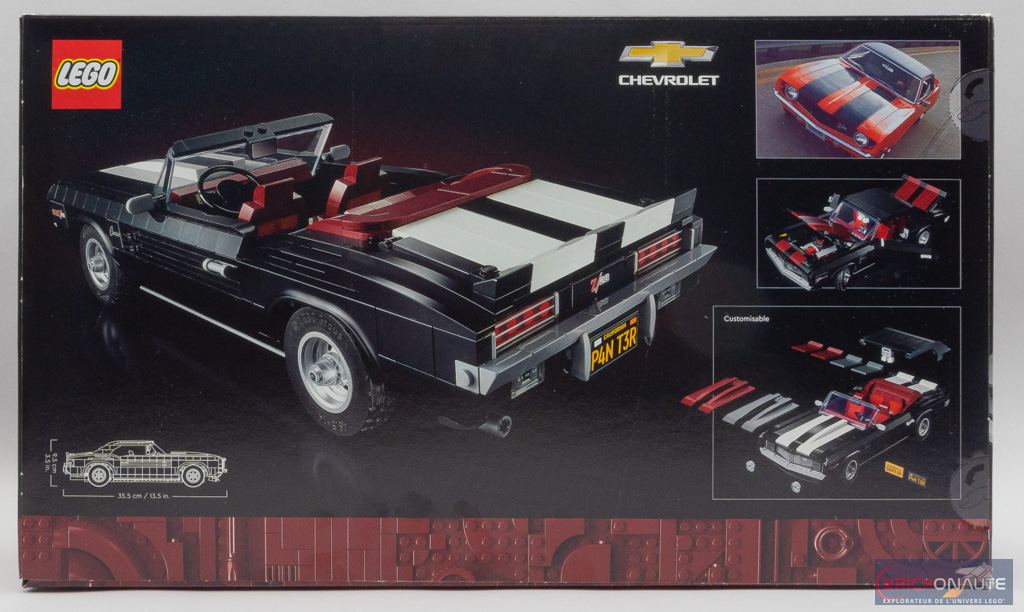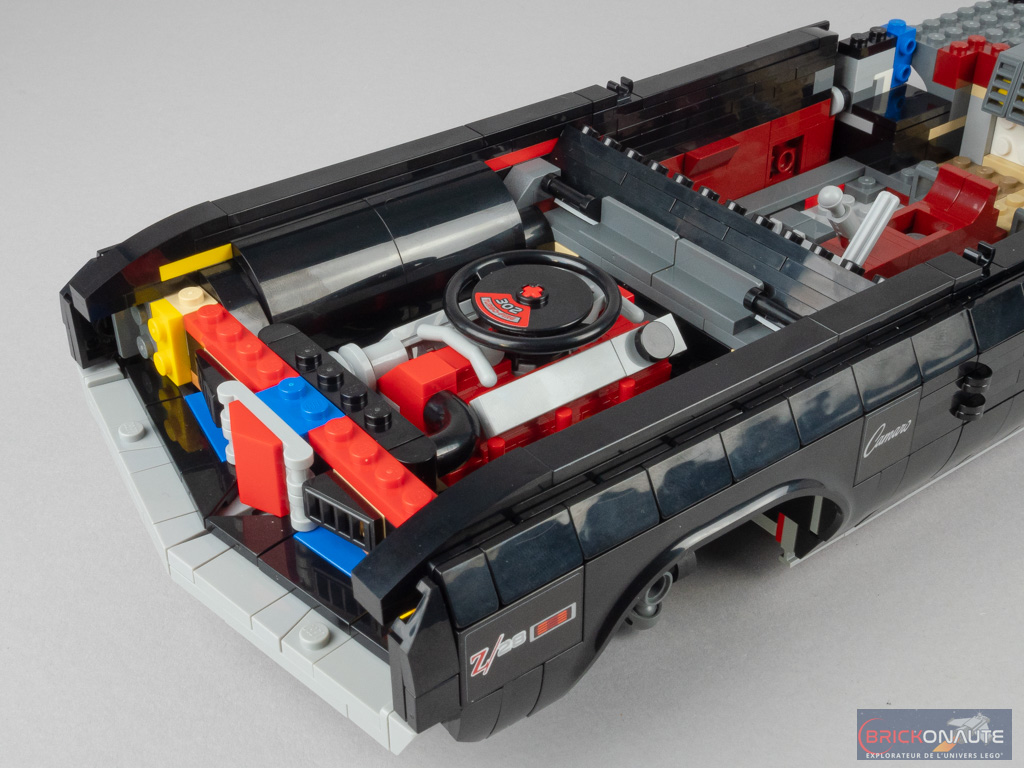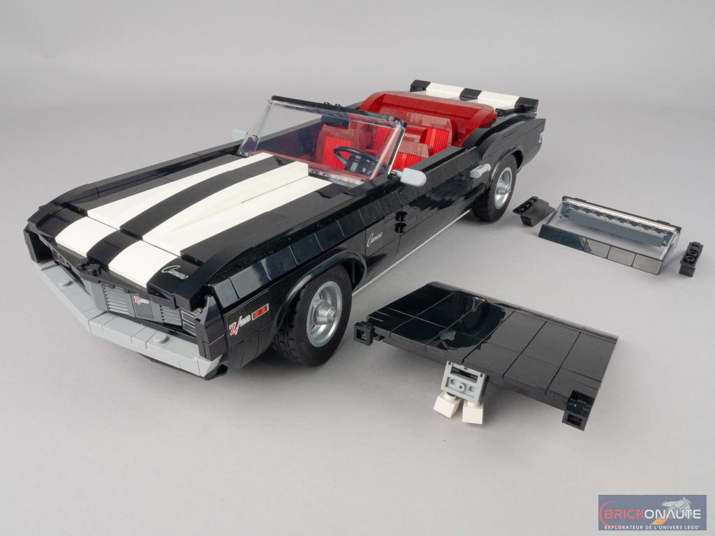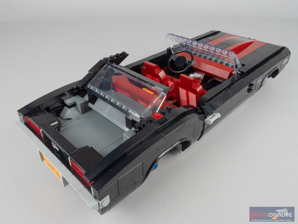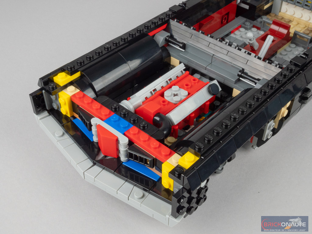 Pour satisfaire les collectionneurs, il est de bon ton chez LEGO de proposer dans ces grosses boîtes quelques options de personnalisation. Ici, on pourra choisir entre la version hard top (toit rigide) ou convertible (cabriolet), la couleur des bandes qui serpentent sur la carrosserie parmi 3 choix possibles, ou encore les phares et les plaques d’immatriculation. Ces possibilités sont toujours bienvenues, tant qu’elles ne nuisent pas au design et c’est ici le cas, même si j’avoue une préférence très personnelle pour la version au toit rigide.