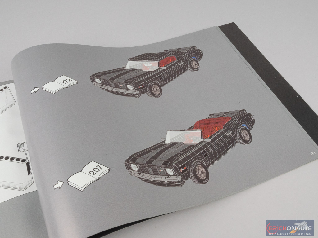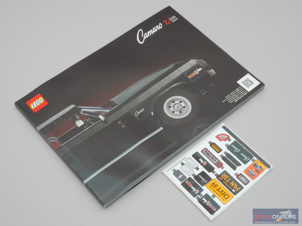 À l’intérieur de la boîte, on trouve 8 sachets de pièces numérotés et 4 pneus en vrac. La notice d’instructions compte 224 pages pour 338 étapes de construction et commence par quelques pages sur l’histoire de la Chevrolet Camaro et de ce modèle en particulier, ainsi que quelques mots du designer, Sven Franic.