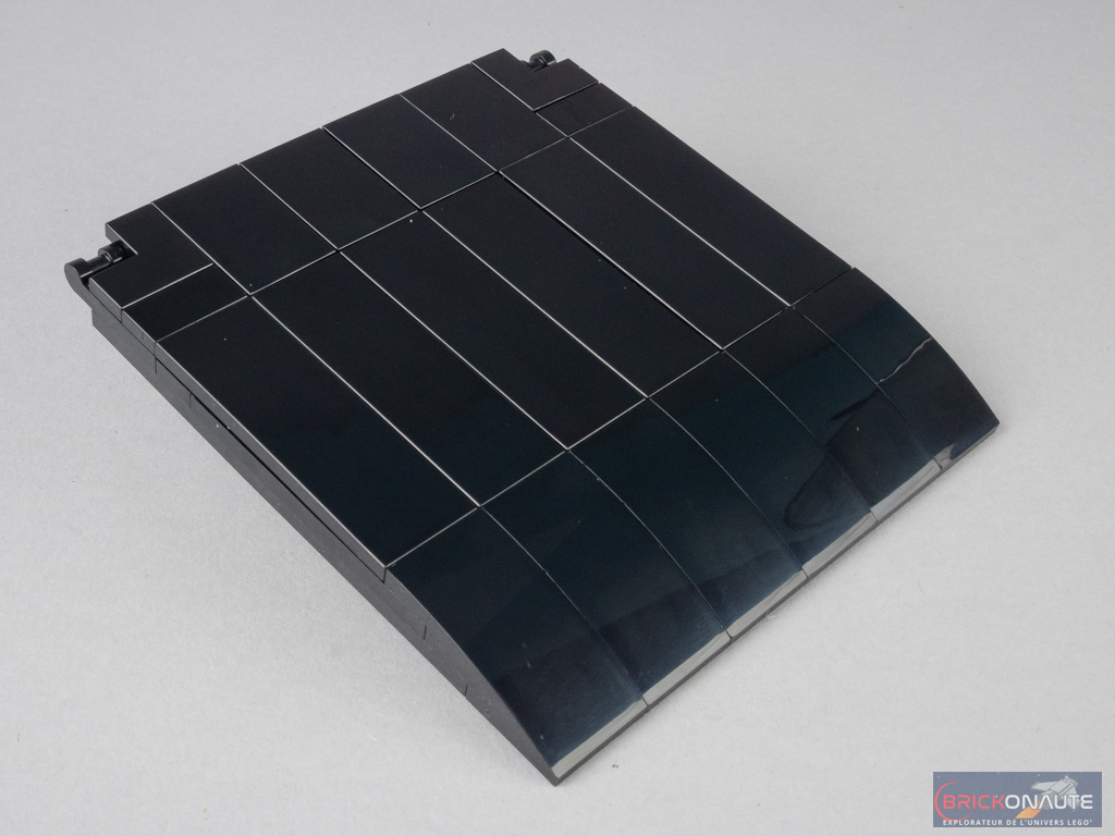 Sur les côtés, je regrette de ne pas retrouver la ligne qui « coupe » le véhicule en deux dans le sens de la longueur, et qui passe au milieu des portières légèrement bombées. C’est pourtant un des points sur lesquels insiste le manuel d’instructions lorsqu’il nous présente le bolide. L’intégration de nouveaux passages de roues était nécessaire et LEGO l’a fait, et on appréciera aussi les très jolies jantes métallisées.