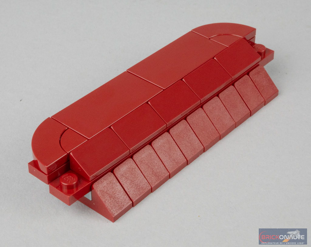 Le sachet de pièces suivant est dédié à l’assemblage des deux portières. Leur conception est plutôt simple : une superposition de briques dark red côté intérieur, et des éléments SNOT pour fixer la carrosserie côté extérieur. Elles sont fixées au châssis par des charnières, et retenues par un petit « bras » qui permet d’éviter de les ouvrir trop largement. Le système sait se faire discret et fait le job, c’est l’essentiel.