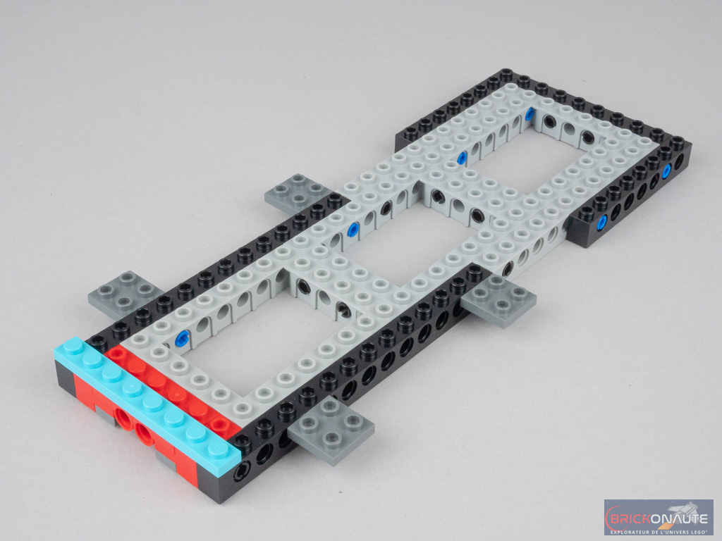 Comme tous les véhicules de cette gamme, on commence la construction avec un châssis constitué de cadres Technic. On le couvre d’un plancher, et de quelques éléments proéminents à l’arrière. Dans l’habitacle, on aperçoit déjà les clips qui serviront à fixer les sièges. On termine avec deux rangées de slopes pour les bas de caisse, puis quelques éléments à l’avant qui serviront à fixer la direction.