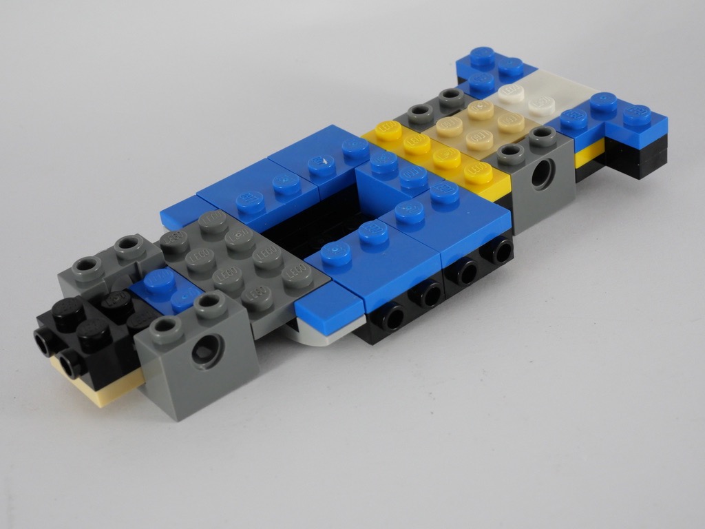 On commence logiquement par le châssis, auquel on vient ajouter les essieux, et que l’on vient agrandir sur l’avant et l’arrière. On dispose quelques briques SNOT(Studs Not on Top, se dit des pièces disposant de tenons sur les côtés) au niveau des bas de caisse et des portières, qui seront habillés par la suite. Les garde-boues sont ajoutés.