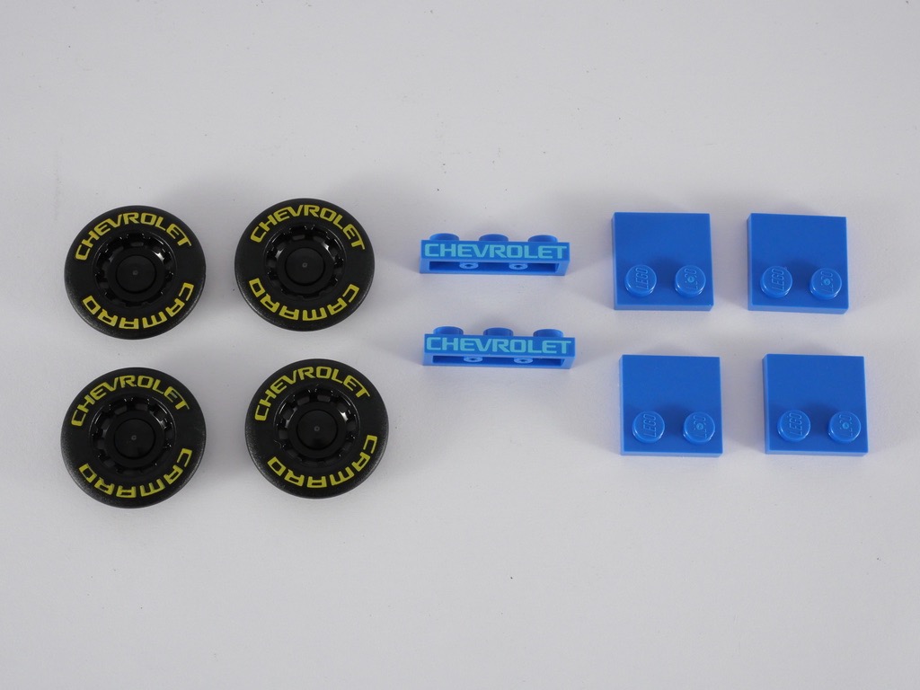 On continue avec la lunette arrière, constituée pour l’essentiel de 2 grandes slopes (décorées d’un stocker…) et d’une vitre articulée sur une charnière pour trouver l’angle idéal. Pour accentuer l’aspect « voiture de course », des arceaux de renforcement gris sont construits dans le cockpit. Il ne reste alors que l’avant de la Camaro à construire. C’est plutôt simple, et l’on regrettera (encore) l’omniprésence d’autocollants, jusque sur le cockpit avec des éléments transparents à appliquer sur les côtés. On termine avec les 4 roues et les superbes décorations tampographiées « Chevrolet Camaro » donnant aux pneus un véritable aspect « course ».