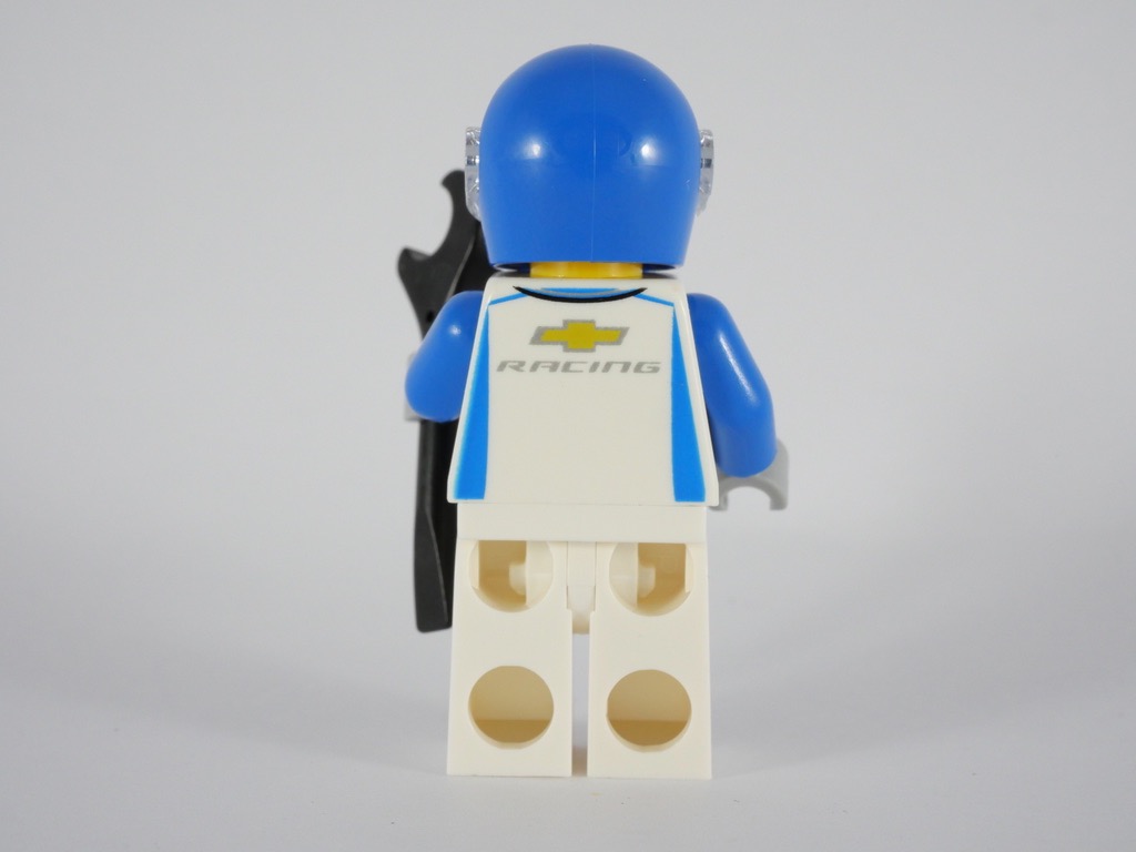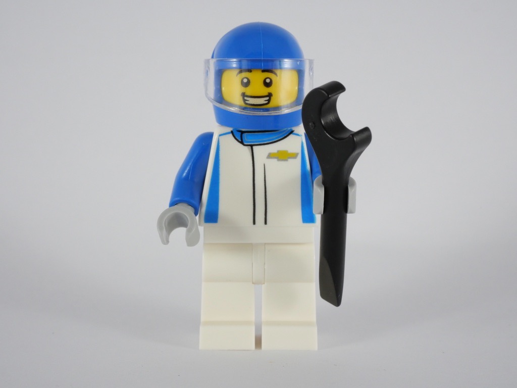 Comme d’habitude avec la gamme LEGO Speed Champions, le set nous est livré avec le pilote de la voiture à construire. Il porte une verste de pilote blanche avec quelques touches de bleu, le logo Chevrolet sur le torse, et le même logo accompagné de la mention « Racing » dans le dos. Les manches sont bleues, et les gants gris. Le visage arbore un large sourire sous le casque bleu, et il dispose d’une clé plate pour réparer la bagnole. Vous l’aurez compris : service minimum pour cette minifig, même si le torse est exclusif.