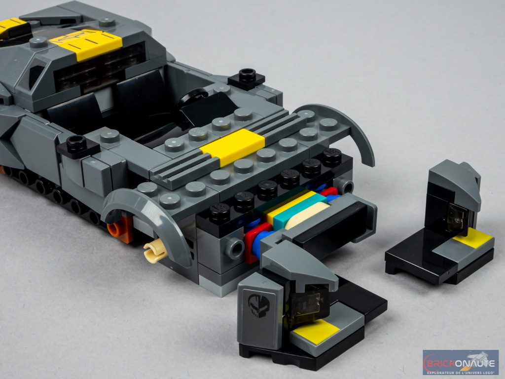 Le bouclier est nettement plus intéressant et est décomposé en deux éléments : un premier sous-assemblage fixé sur des éléments SNOT en partie basse, et un second solidaire du capot reproduisant la forme pointue caractéristique de la voiture. On achève la construction avec quelques slopes, le pare-brise et les 4 roues. Observez ici les superbes dishs tampographiés en guise de jantes.
