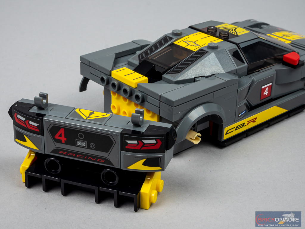 La conception du bouclier est intéressante avec 3 sous-assemblages, qui ne reproduisent malheureusement pas la forme « pointue » caractéristique des Corvette. Nous décorons les bas de caisse avec de grands autocollants, puis nous ajoutons le pare-brise / toit et les petits rétroviseurs. On termine la construction avec un sous-assemblage intéressant à l’arrière, même si les phares auraient mérité une solution brick built. Ne manque que l’aileron fixé sur des clips, et les 4 roues avec leurs pneus taille basse.