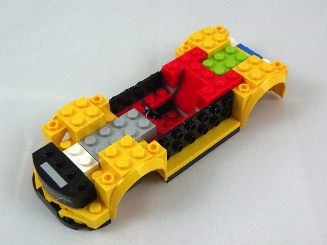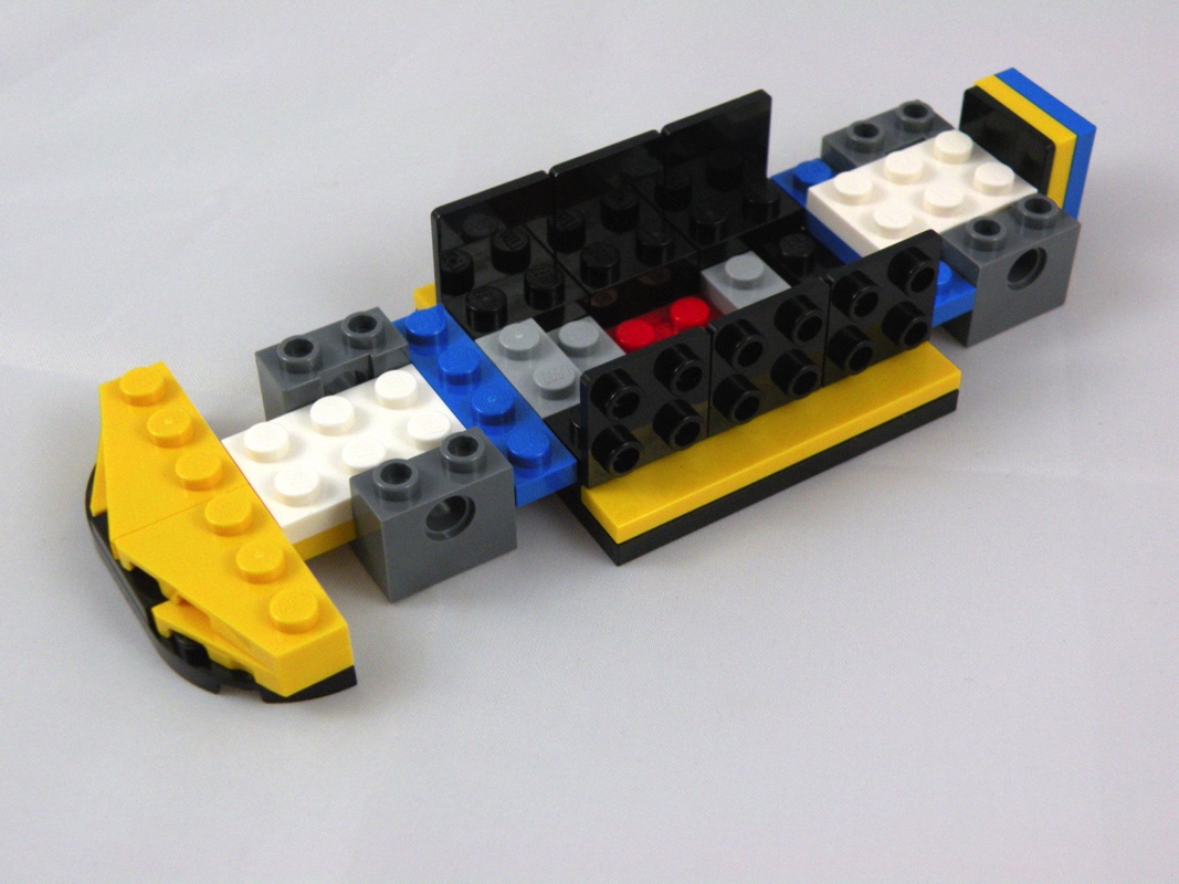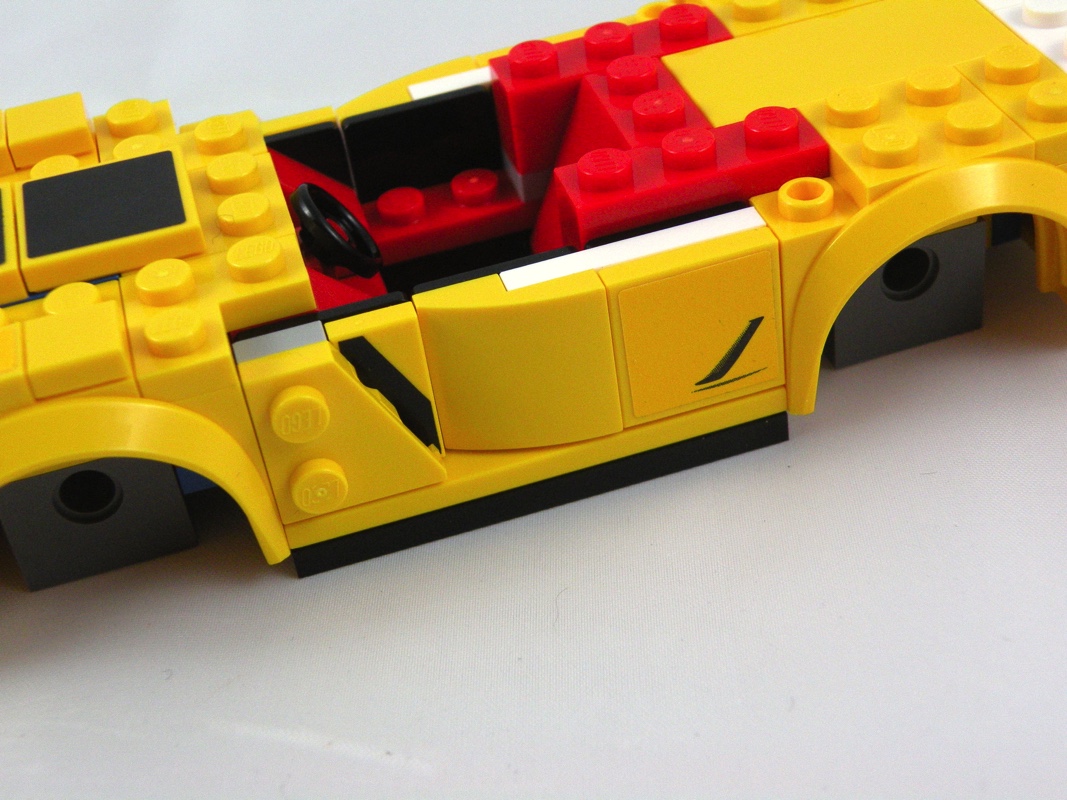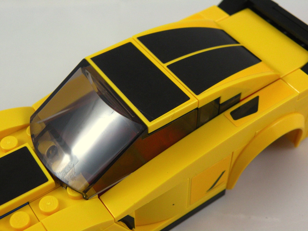Concernant la forme générale, c’est plutôt réussi pour une reproduction à cette échelle, le mélange de pièces de différentes courbures est intéressant. Mention particulière à ces deux très grandes pièces (Yellow Slope, Curved 10 x 1) qui viennent prendre place au dessus des portières. Deux tiles 2×1 tampographiées viennent également prendre place sur les côtés de la partie avant du cockpit, dommage que ce soient les seules. On remarque comme toujours la différence de teinte entre les autocollants et les pièces…