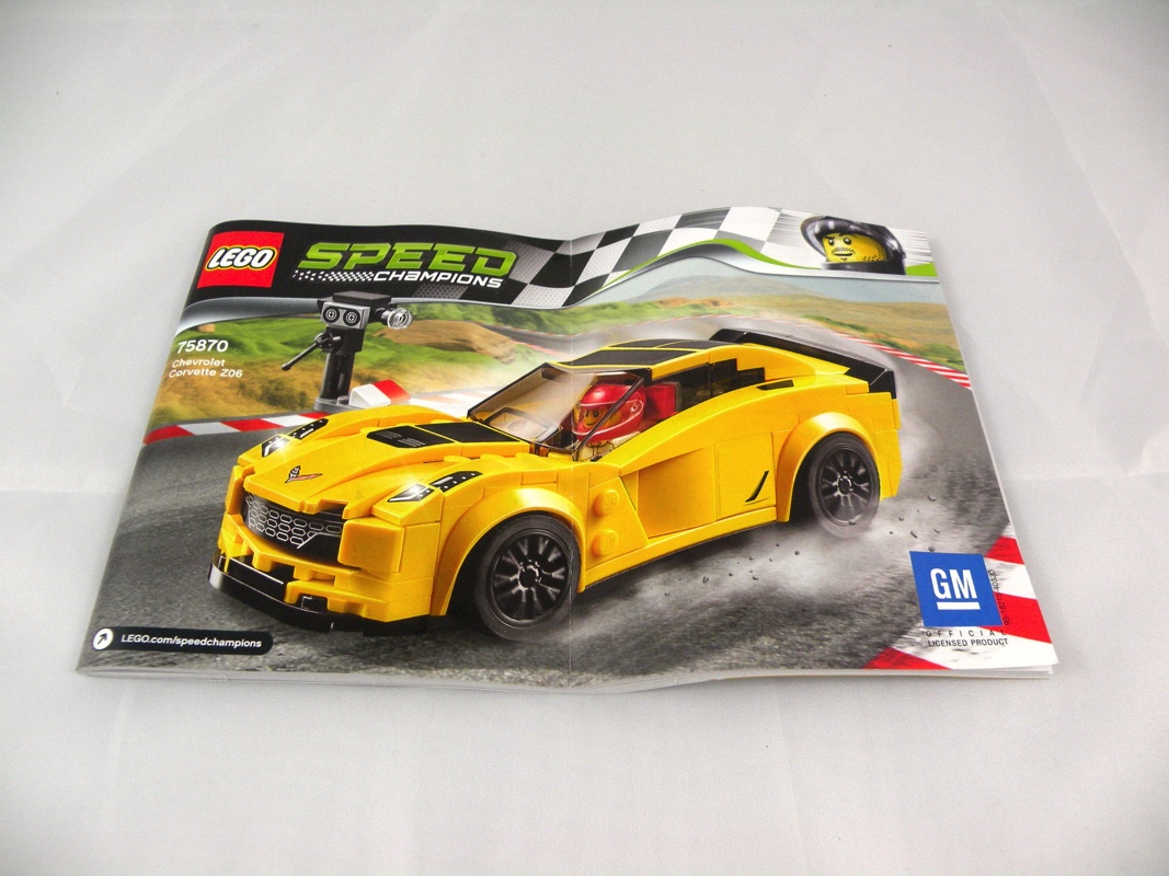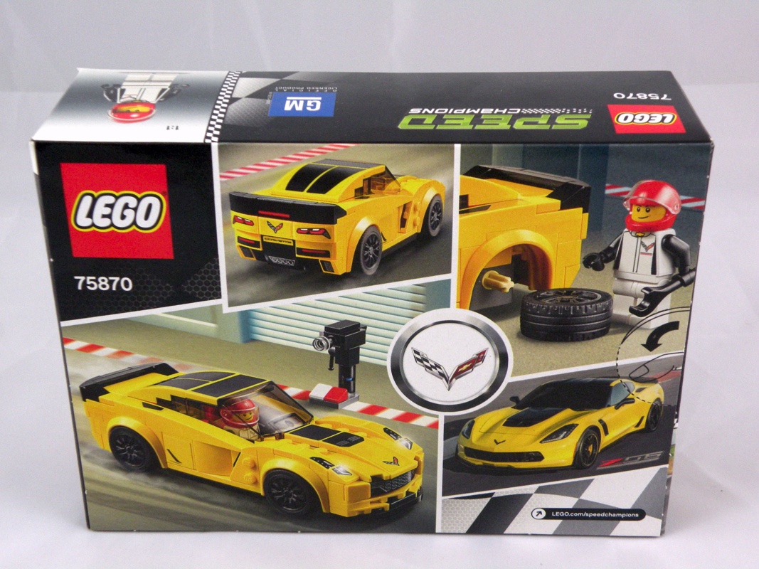 Classique dans la gamme Speed Champions, cette boîte ne déroge pas à la règle. Sur l’avant, on voit la voiture en situation de course, avec le pilote au volant, et la caméra en bord de piste. En bas à droite, le logo de la marque. On retrouve également le logo General Motors sur le haut. A l’arrière, une photo du vrai bolide aux côtés de deux autres vues du modèle LEGO en « course », ainsi qu’une illustration de la possibilité de transformer notre pilote en mécanicien.