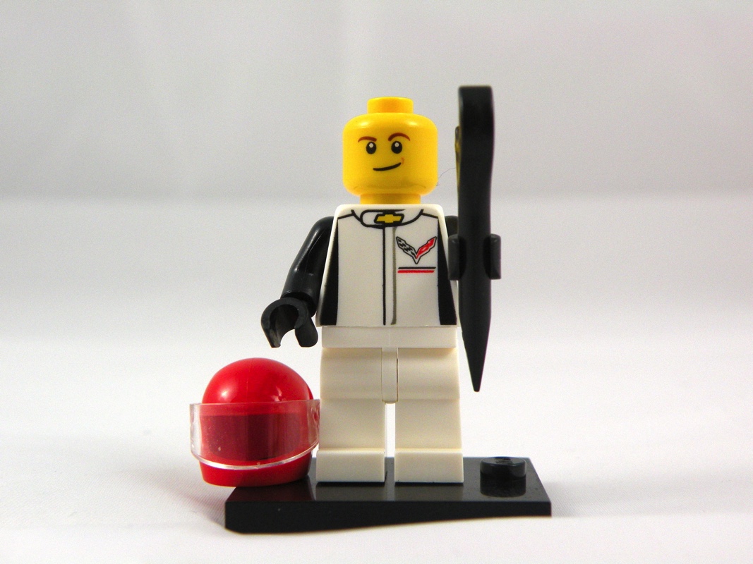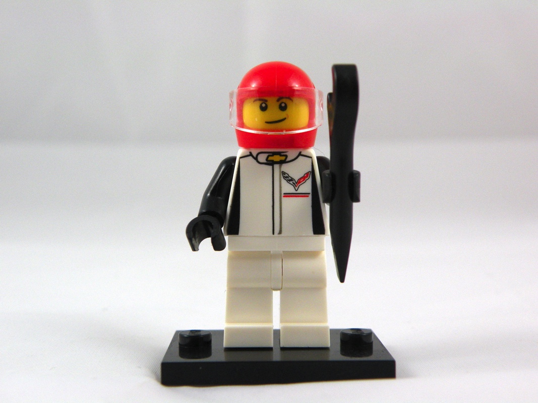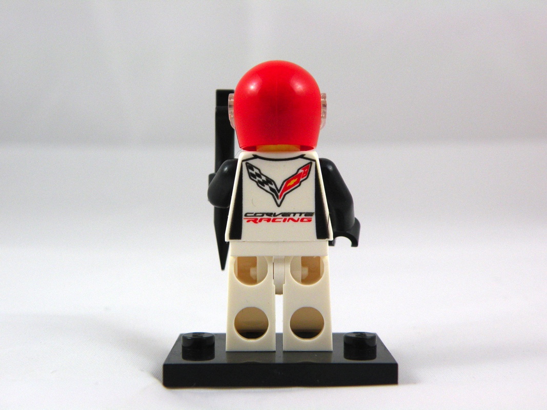 Comme (très) souvent, nous avons ici le pilote de la voiture, qui peut également se « transformer » en mécanicien avec la clé plate qui lui sert d’accessoire. Il porte un pantalon blanc monochrome, avec une veste blanche tampographiée du logo Corvette, et de la croix caractéristique de la marque Chevrolet au niveau du cou. Sur le dos, un grand logo Corvette Racing. Les manches et les gants sont noirs, et il porte un casque rouge avec sous ce dernier un visage présentant un petit sourire en coin. C’est simple, on aurait peut-être apprécié un niveau de détail un peu plus poussé, notamment au niveau des bras et des jambes