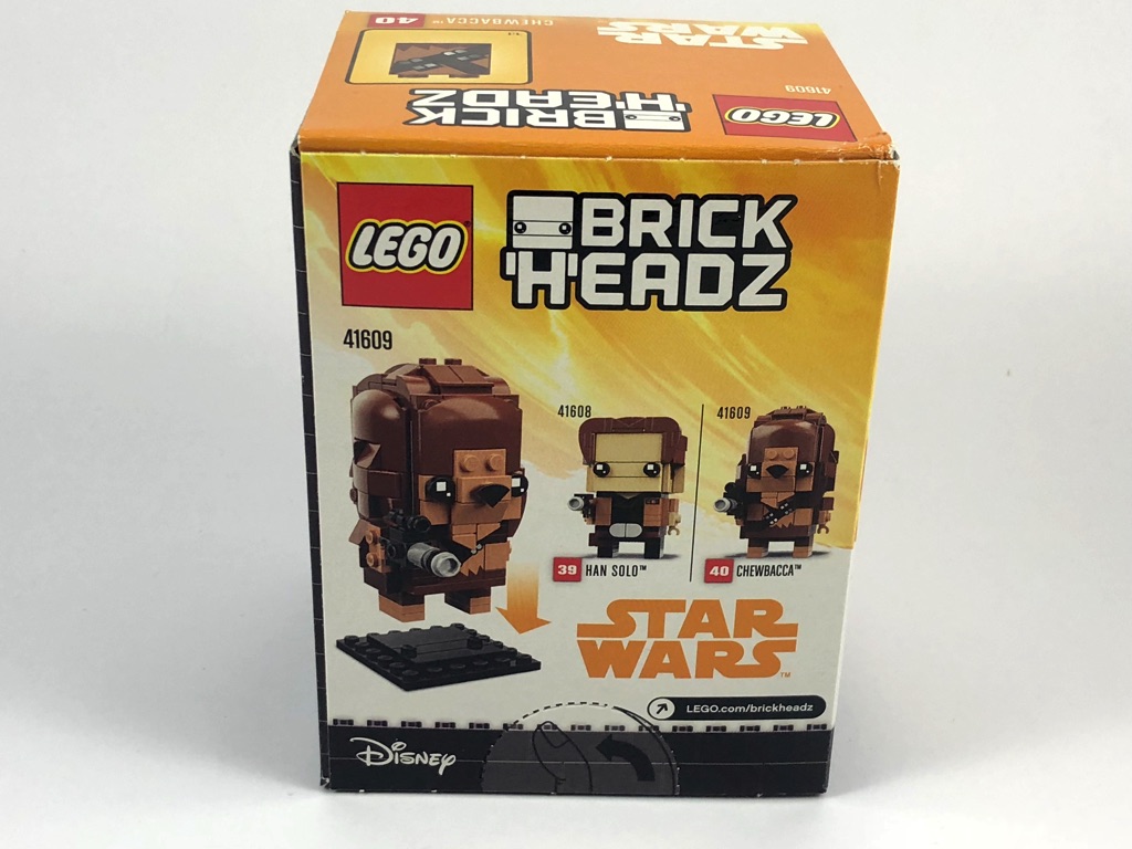 On trouve une petite boîte au format habituel des BrickHeadz vendues à l’unité, avec sa languette à déchirer pour l’ouvrir. De couleur jaune, comme l’ensemble des sets basés sur Solo: A Star Wars Story, vous ne pourrez pas la louper dans les rayons. Sur l’avant, on trouve la BrickHeadz sans son socle, sur l’arrière Chewie est présenté aux côtés de son comparse 41608 – Han Solo, et on trouve sur le côté une photo de notre Wookie préféré.