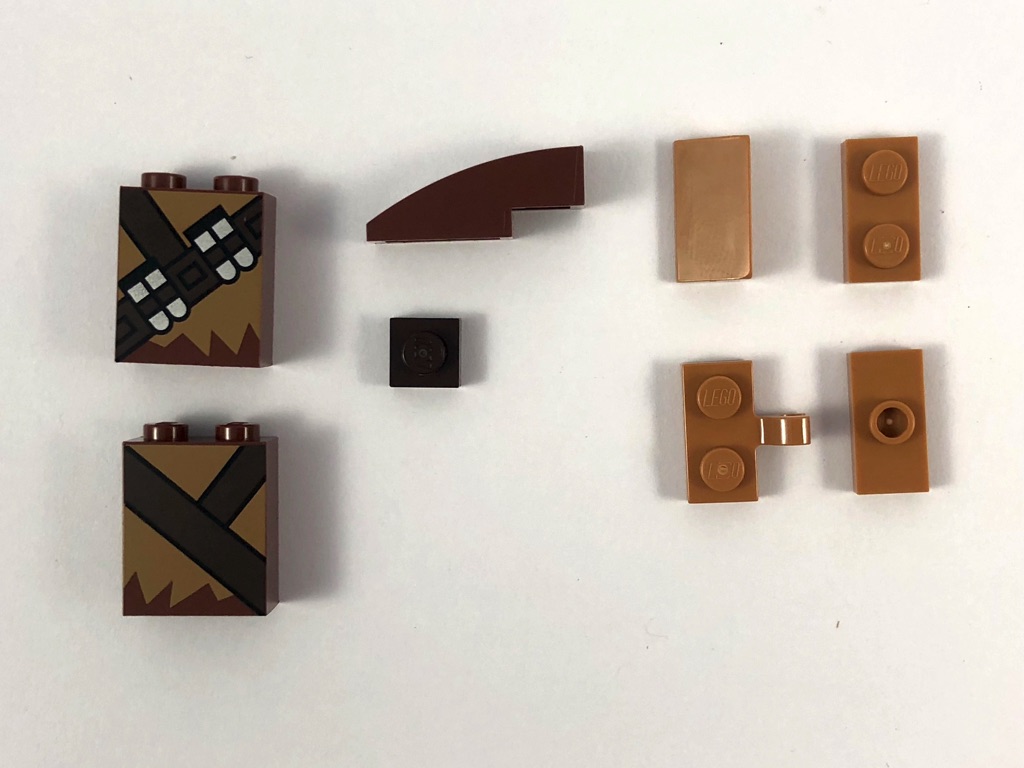 La construction est plutôt « standard » pour une BrickHeadz. On commence par le torse, où l’on ajoute un bracket noir surmonté d’une tile qui fait office de fourreau pour le blaster de Chewie. On complète en ajoutant les briques SNOT qui recevront les bras, et les deux pièces tampographiées avec la cartouchière sur l’avant et l’arrière du torse. La couleur de cette cartouchière est rappelée avec des plates 1×1 en dark brown judicieusement disposées. Les bras se composent de deux cheese slopes pour les poils, et des deux habituelles Plate, Modified 1 x 2 with Clip Horizontal on Side pour les mains, dans une couleur plutôt rare : medium dark flesh. On ne trouve cette pièce que dans un seul autre set : le 41597 – Go Brick Me, dont je vous dis tout le bien que j’en pense dans cet article 😉