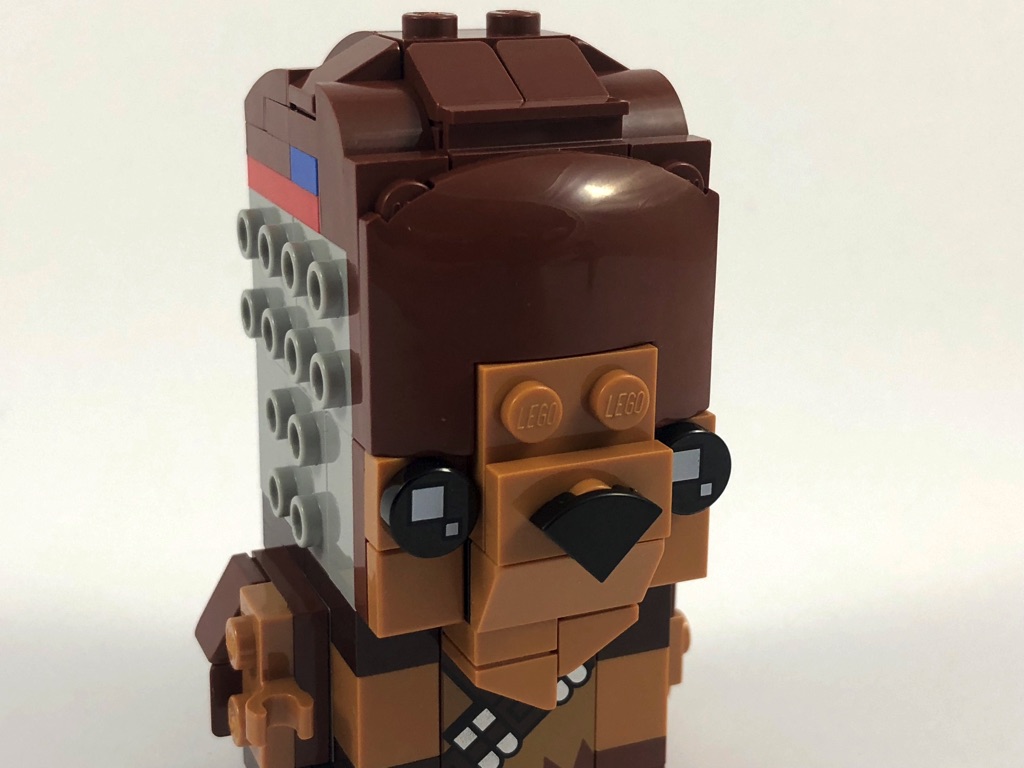 Soyons francs : mes craintes relatives au design de ce modèle se sont avérées justes. Même si le but premier des BrickHeadz n’est pas d’être d’une fidélité sans faille au personnage original (et heureusement), on notera quelques points aisément perfectibles. Alors que le choix de couleurs est plutôt bon, on regrettera une transition trop abrupte sur le visage entre le reddish brown et le medium dark flesh. De la même façon, les transitions entre les surfaces lisses et celles avec des tenons sont assez bizarres. Et finalement, seule la tampographie des pièces du torse nous rappelle qu’on à affaire à un wookie poilu. Dommage.