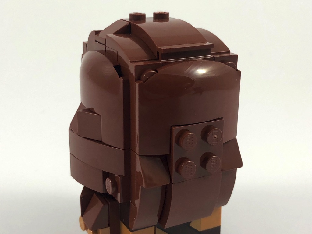 La structure de la tête est identique à la plupart des autres BrickHeadz : elle se compose de 12 briques SNOT, et (entre autres) de la brique 2×2 rose en son centre. On l’habille sur toute sa surface de pièces couleur reddish brown, hormis le visage et la « barbe » couleur medium dark flesh. La transition est plutôt abrupte. On notera également la présence de 4 Wedge 3 x 4 x 2/3 Triple Curved, sur les 4 côtés de la tête.