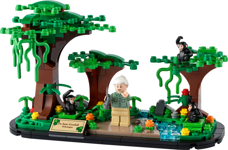 Dans cette petite boîte, vous trouverez 276 pièces pour construire une scène rendant hommage à Jane Goodall, , éthologue et anthropologue britannique célèbre notamment pour son travail sur les chimpanzés.