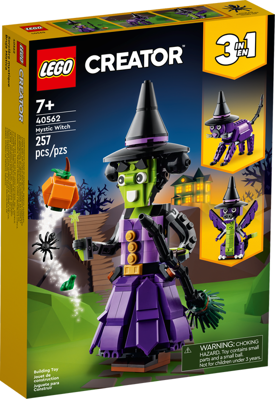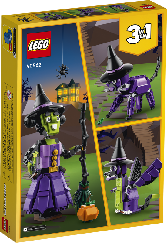 Avec ce set de 257 pièces, LEGO nous propose la construction d’une sorcière équipée de son balai et de sa baguette magique. Et il est possible de la transformer en chat ou en dragon, coiffés du même chapeau, avec les instructions alternatives.