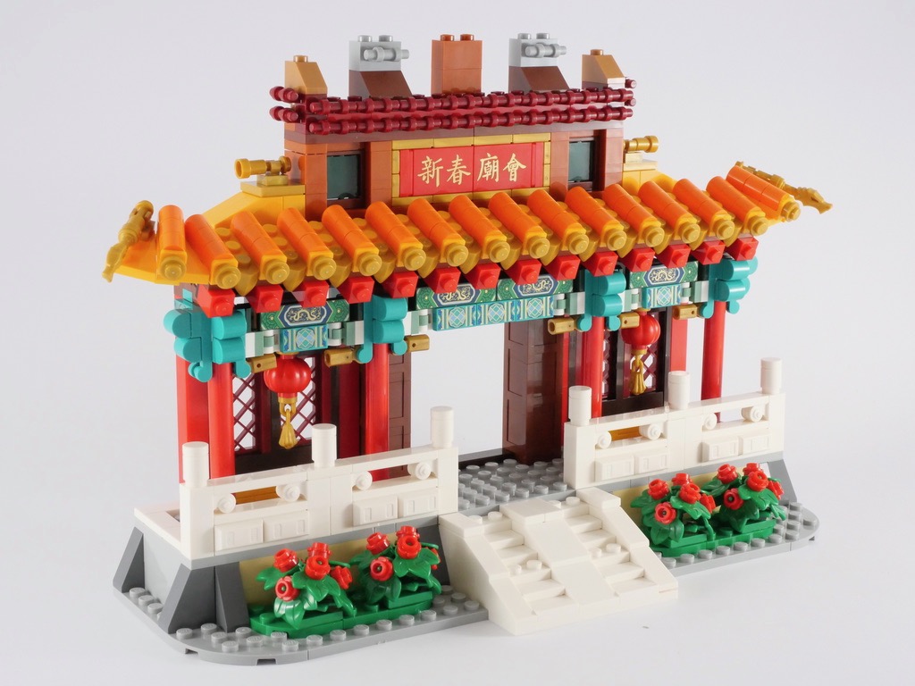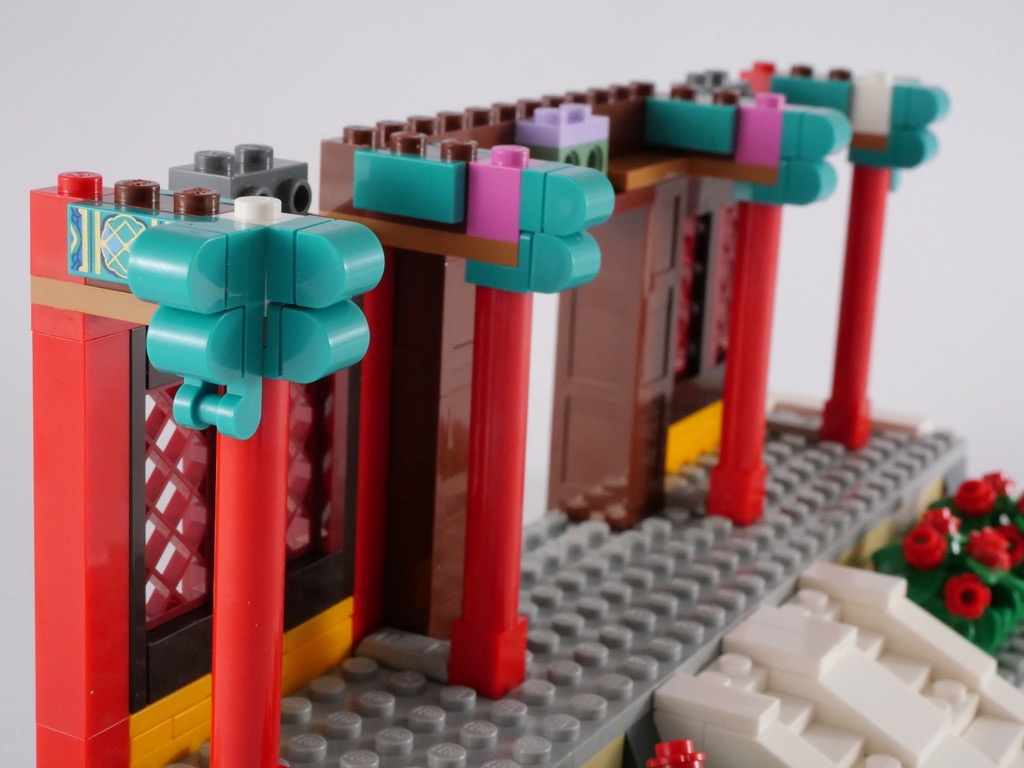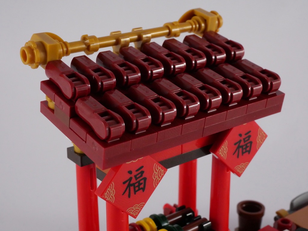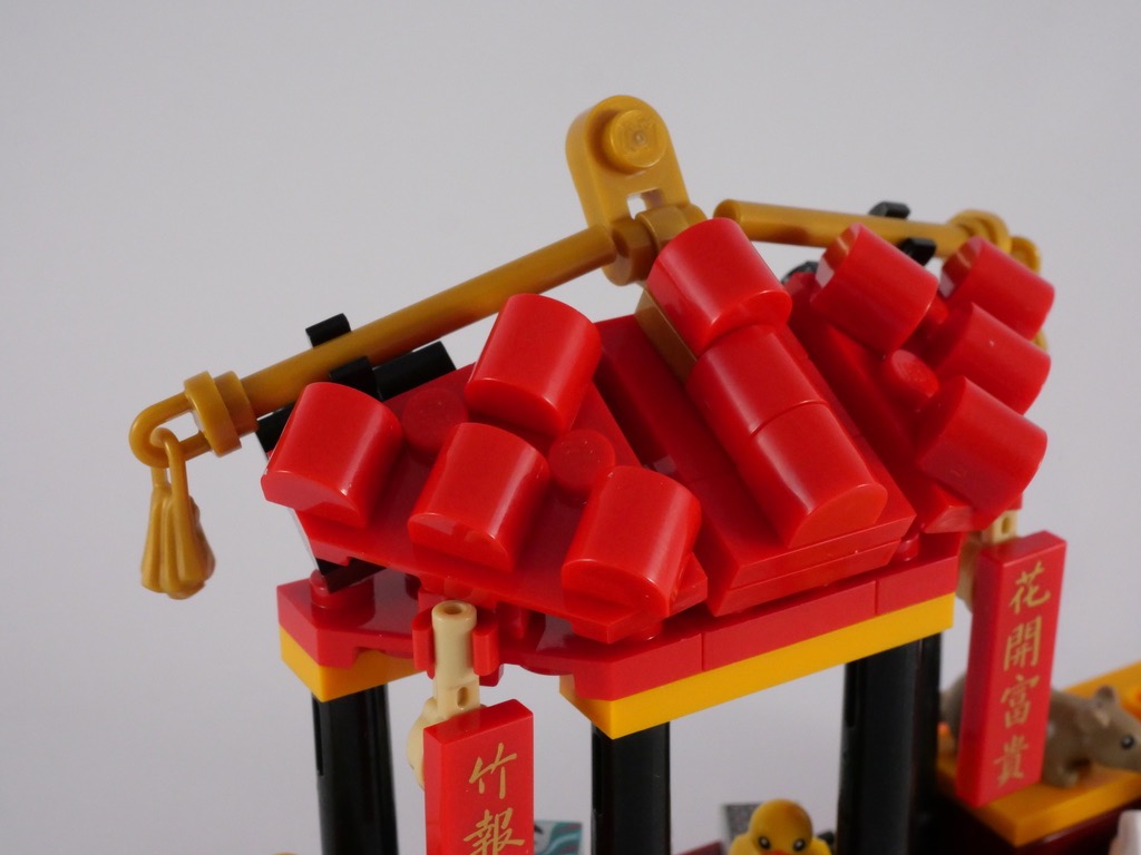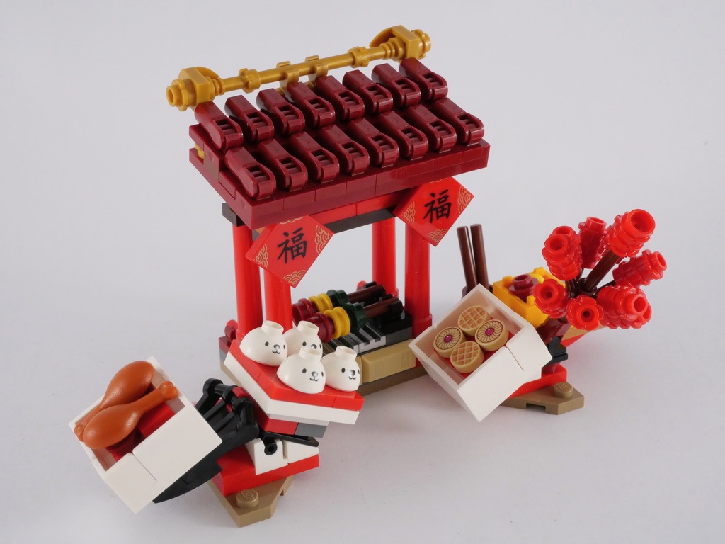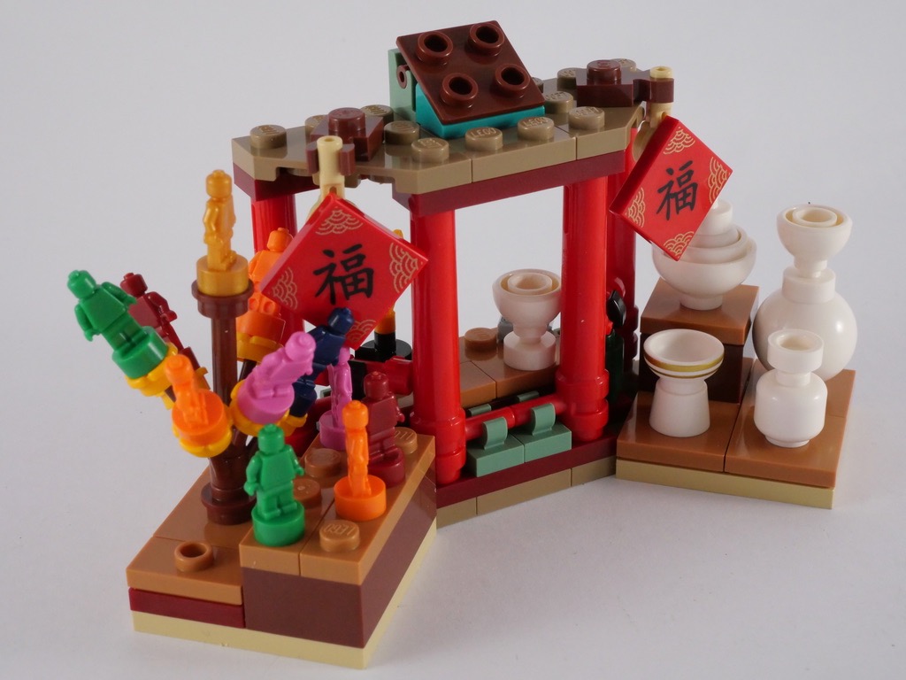La jouabilité est également un des points forts de ce set. En particulier grâce au nombre de minifigs qu’il contient. Mais également grâce à la variété des stands et des accessoires qu’on y trouve : de la nourriture, de jouets, des peluches, des feux d’artifice, de la vaisselle et j’en passe. On pourra s’amuser avec un marionnettiste dans son théâtre, avec un vendeur de brochettes derrière son stand, ou avec les grands-parents se rendant au temple. N’espérez cependant pas faire grand-chose dans ce dernier, puisque seule la façade est représentée. Ce qui peut aisément se comprendre, aménager un temple entier avec son intérieur aurait très certainement fait enfler le prix de manière considérable. On aurait tout de même aimé quelques espaces jouables au dos, mais il n’en est rien.